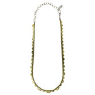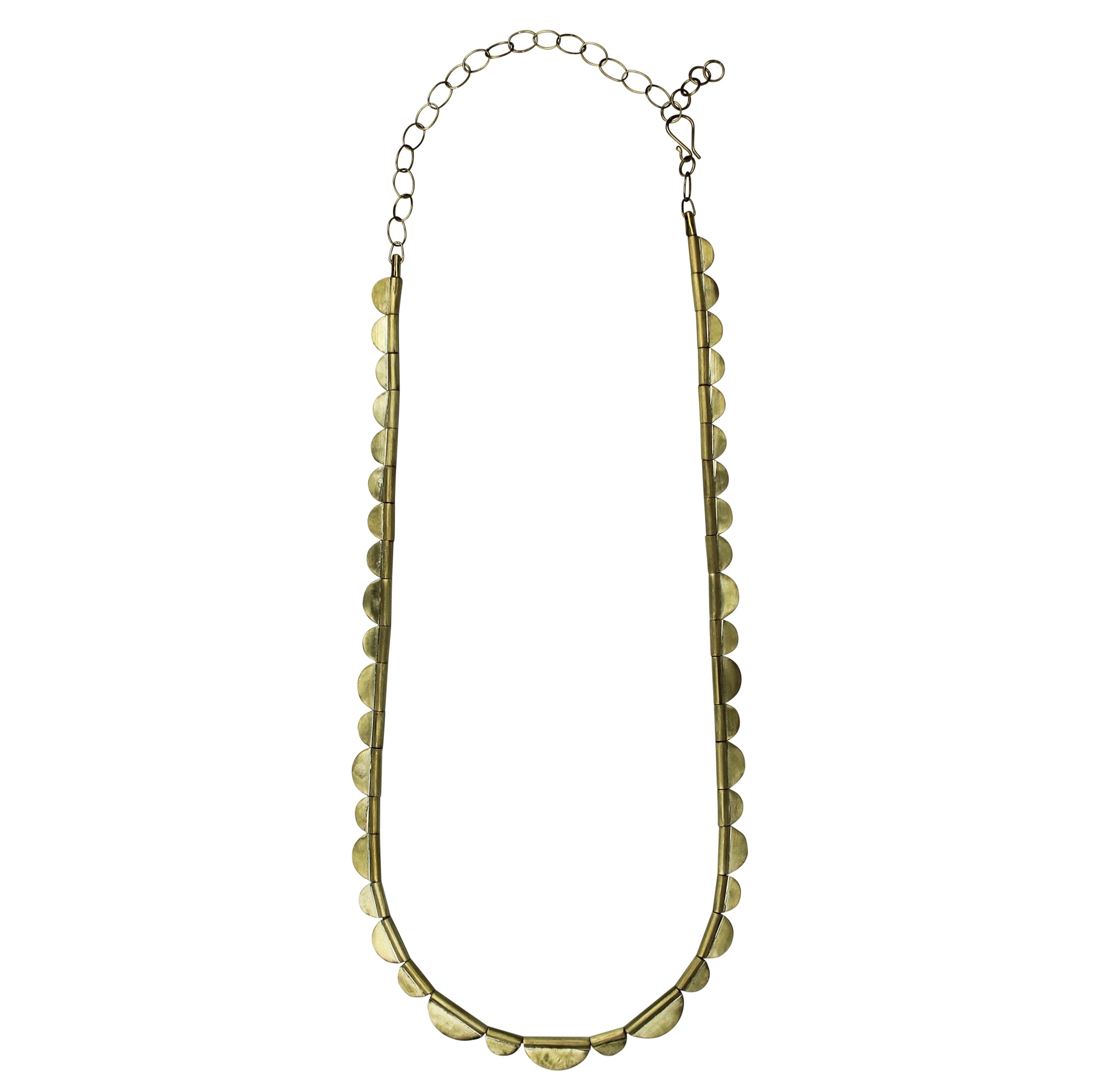 Handmade brass tabs in undulating sizes are strung together creating an easy to wear necklace with gentle movement. 24” length on adjustable chain