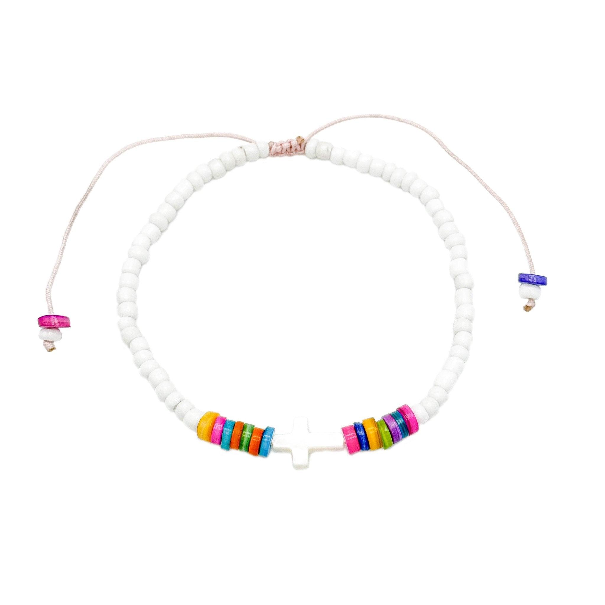 Such a fun and comfortable anklet for the beach, pool deck, or shorts, capri or sundress looks. A white cross made from shell is surrounded by bright, colorful shell beads and then white seed beads. They are strung on a white adjustable cord to fit every ankle! 8-14 inches.