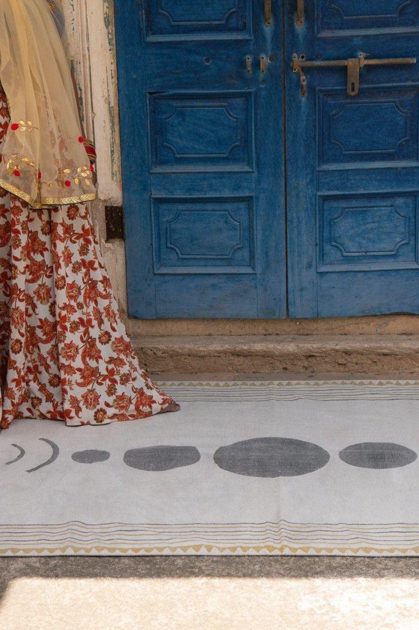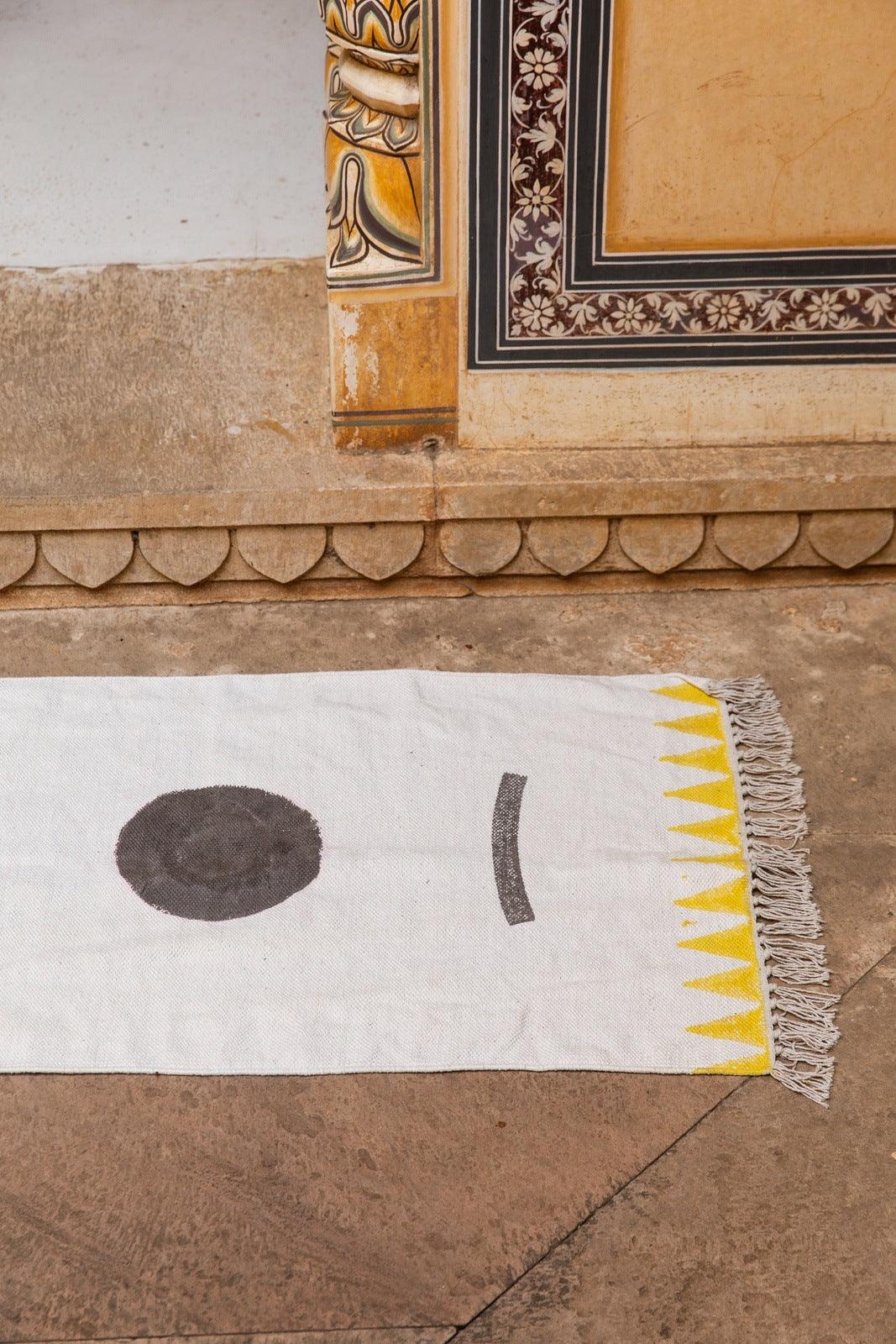 The design is hand-pressed onto each rug using hand-carved wooden blocks dipped in dyes. All rugs are made in small batches.