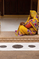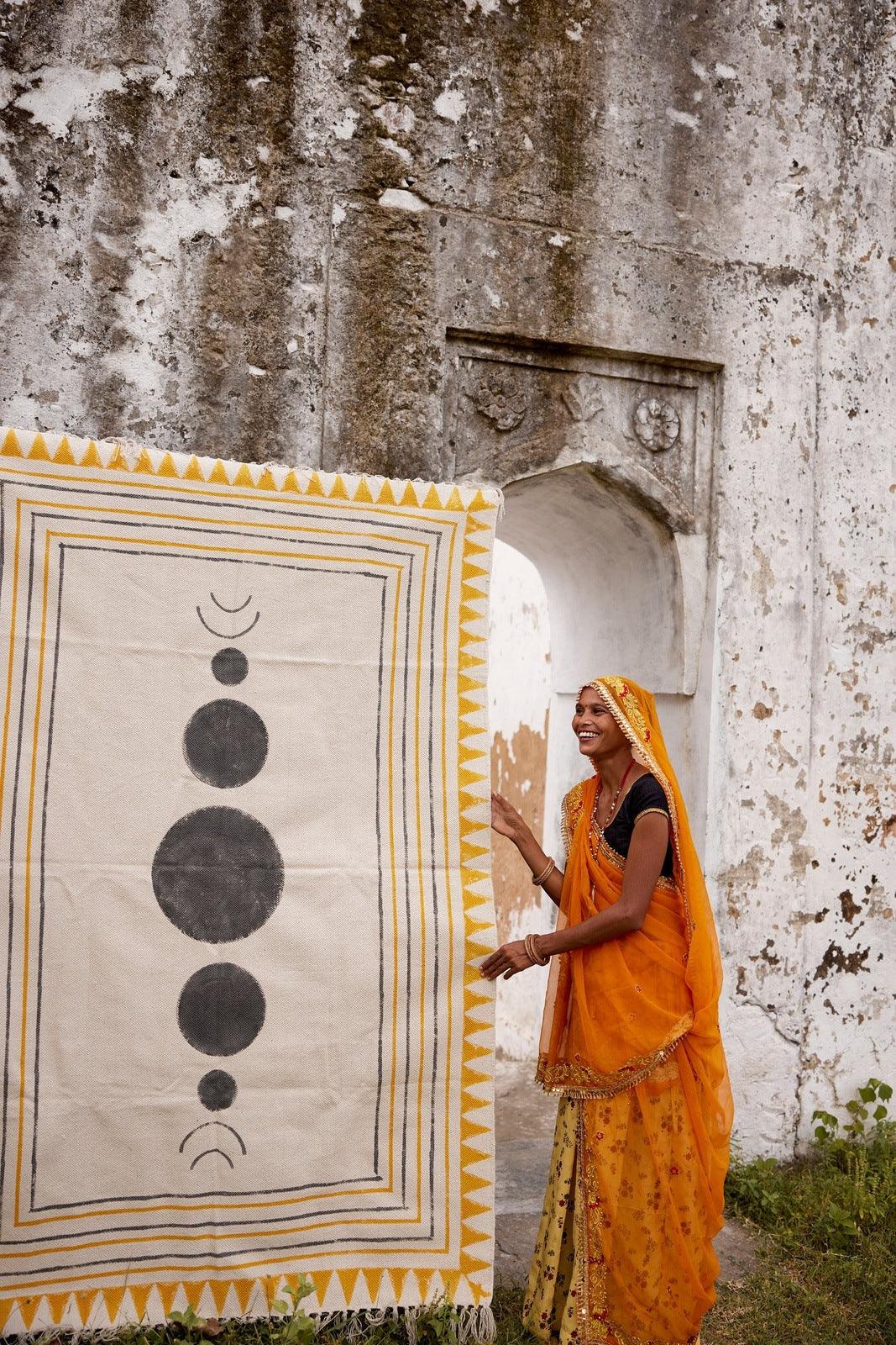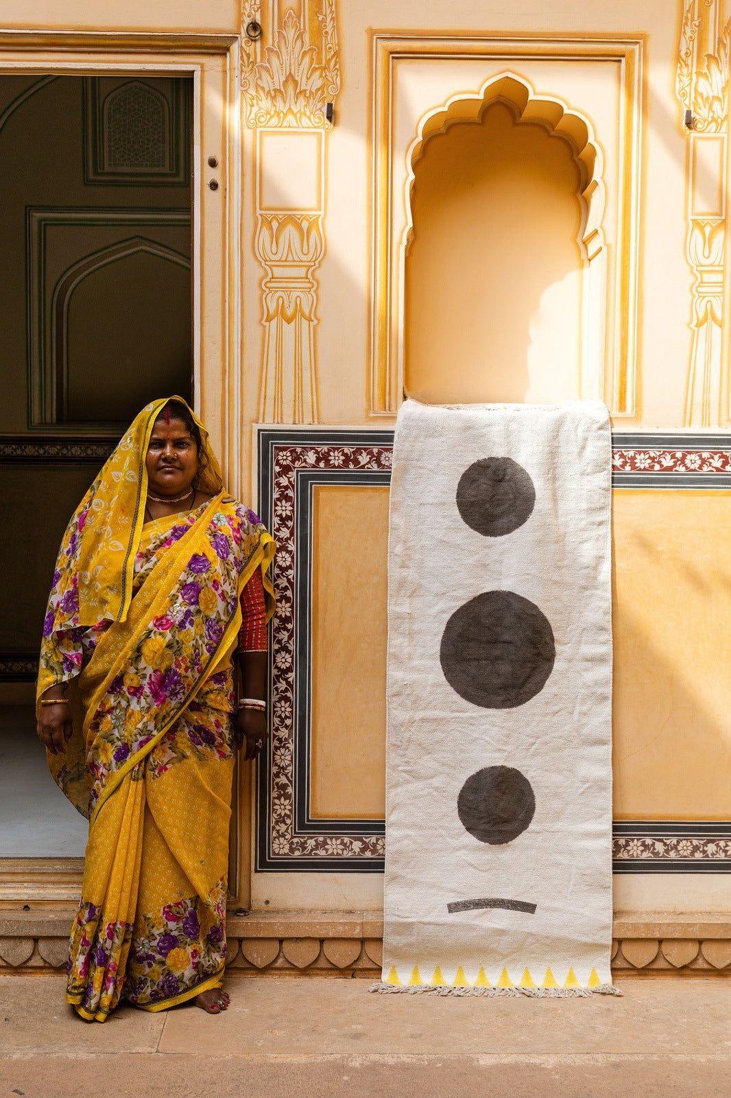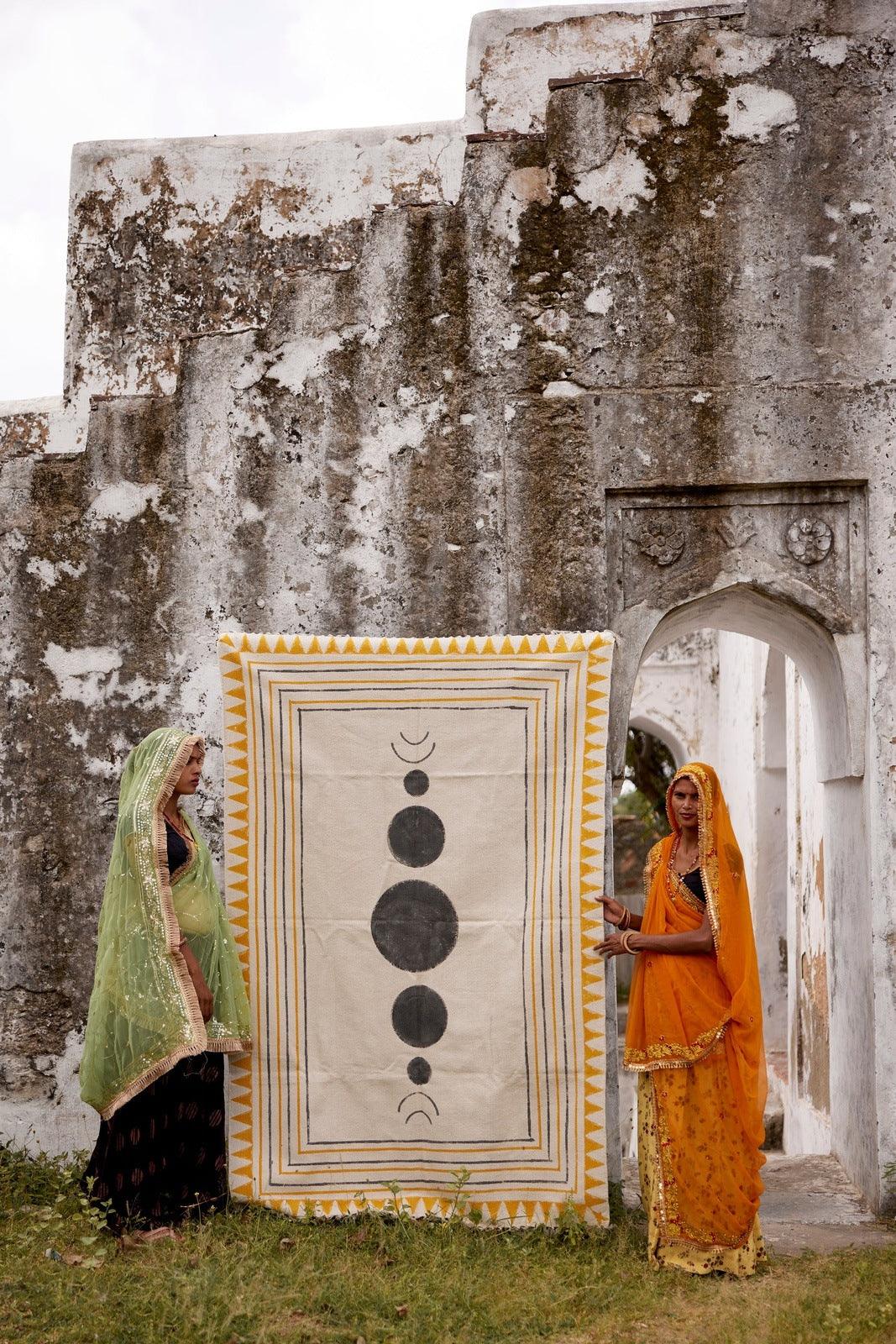 Each rug is handmade, requiring attention from 4 different types of artisans, including wood carvers, block printers, weavers, and dye specialists.