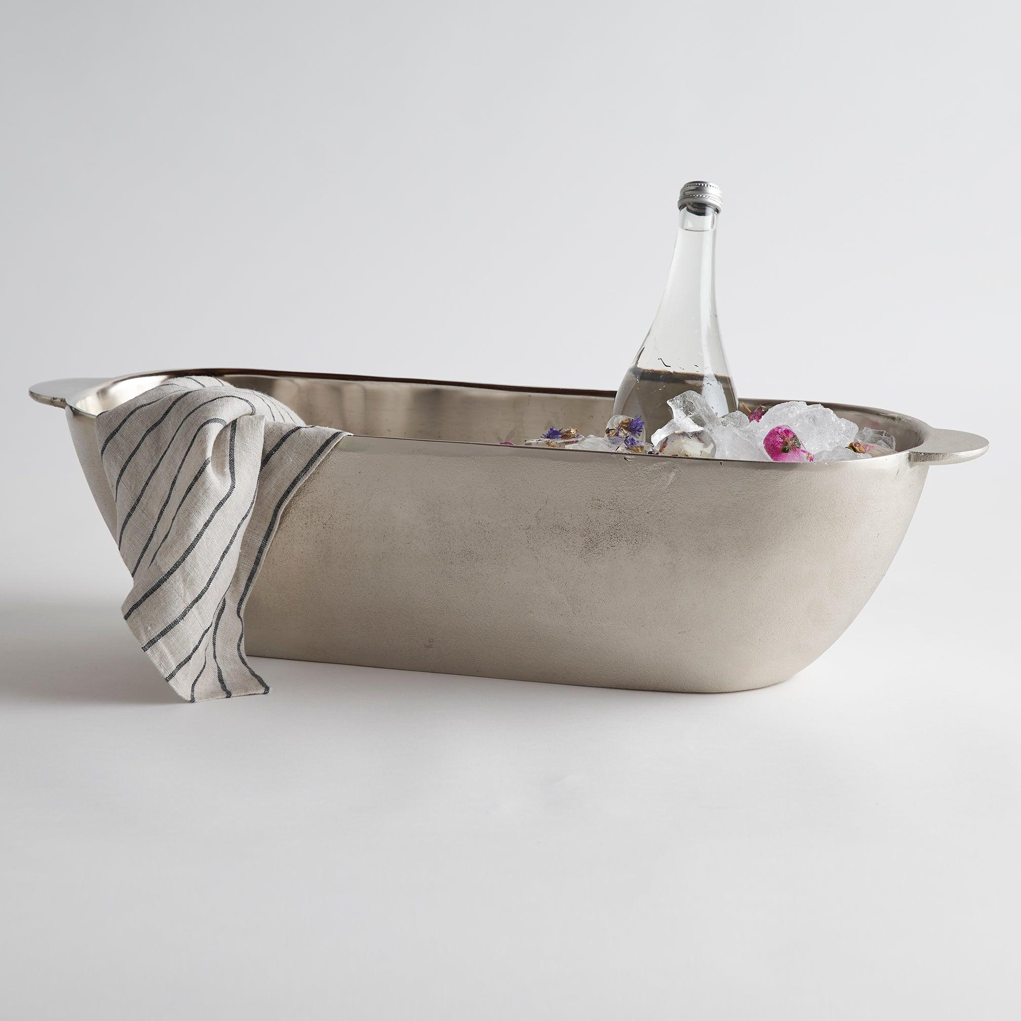When an afternoon gathering calls for cold beer or a refreshing bottle of water, head over to this oblong trough to make your selection. Rounded, flared ends accommodate extra ice to keep cans and bottles surrounded in cold. The silvery nickel finish brings a mellow shine to the festivities while highlighting the beauty of the hand-cast aluminum construction.