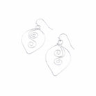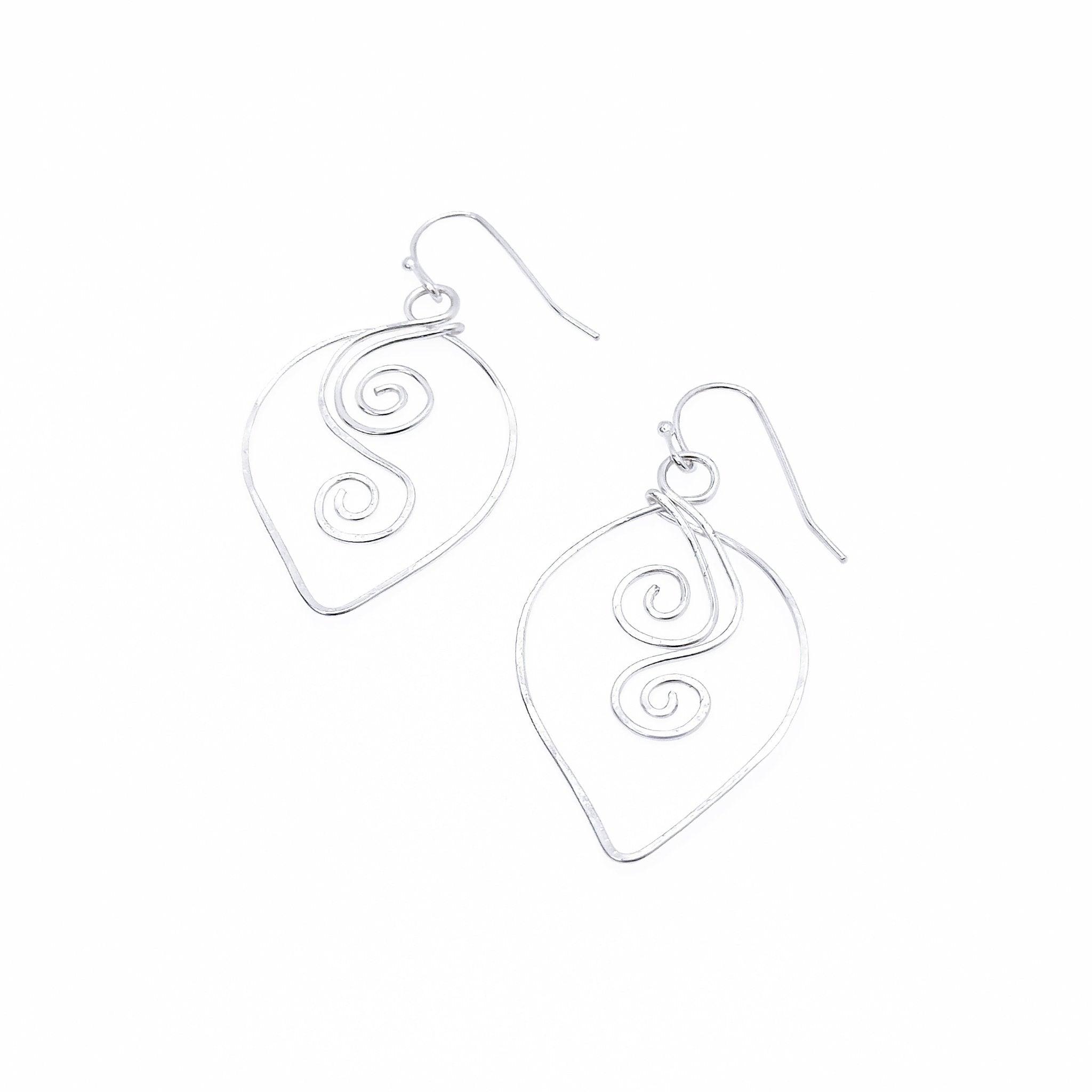 Hammered silver plated wire swirls in opposite directions inside the inverted teardrop and dangles from a hypoallergenic silver plated fishhook.