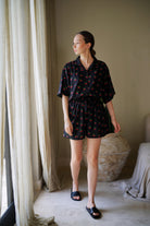 Made for everyday wear, this summer set is featured in a cherry printed fabrication with a timeless button-down collar shirt and matching high-rise shorts.