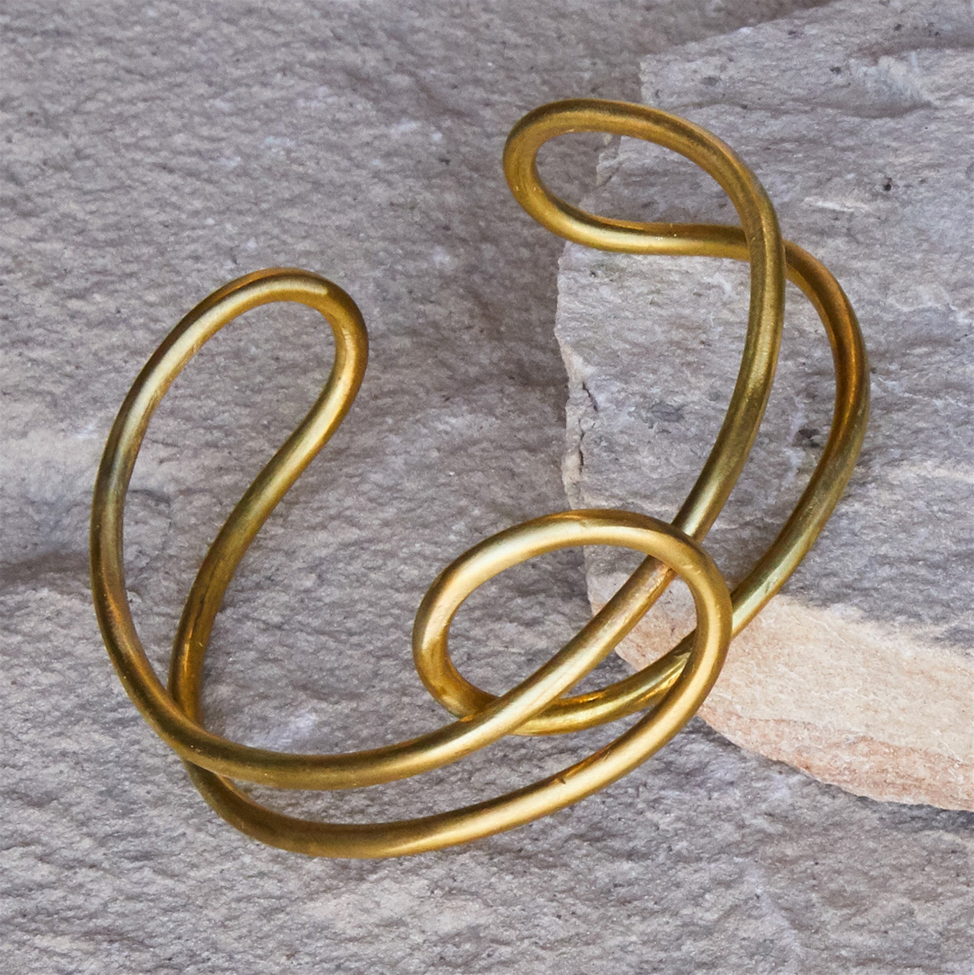 Thick, brass wire is bent and looped to create these classy, comfortable and adjustable cuffs. 2.5"x0.75"x2.5"