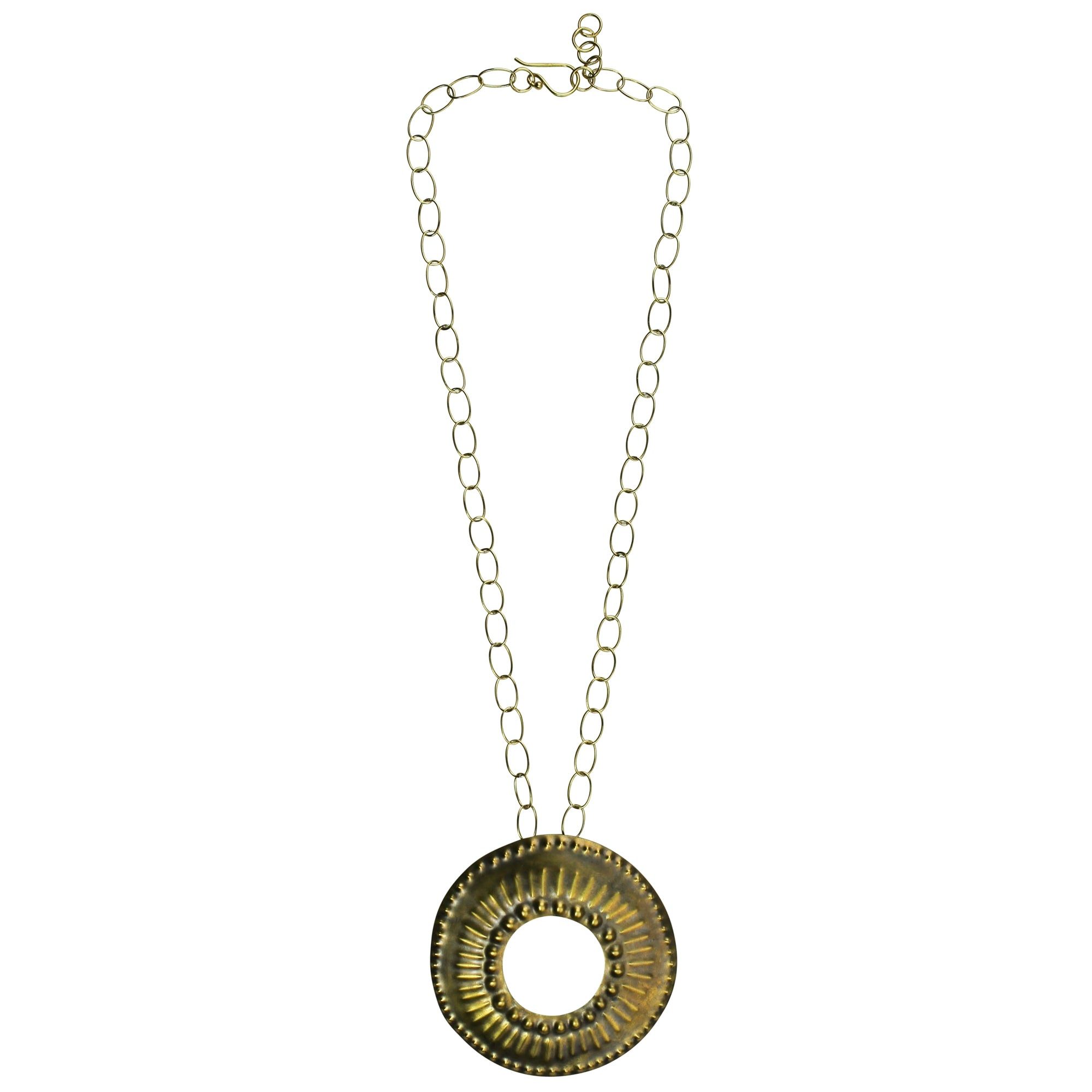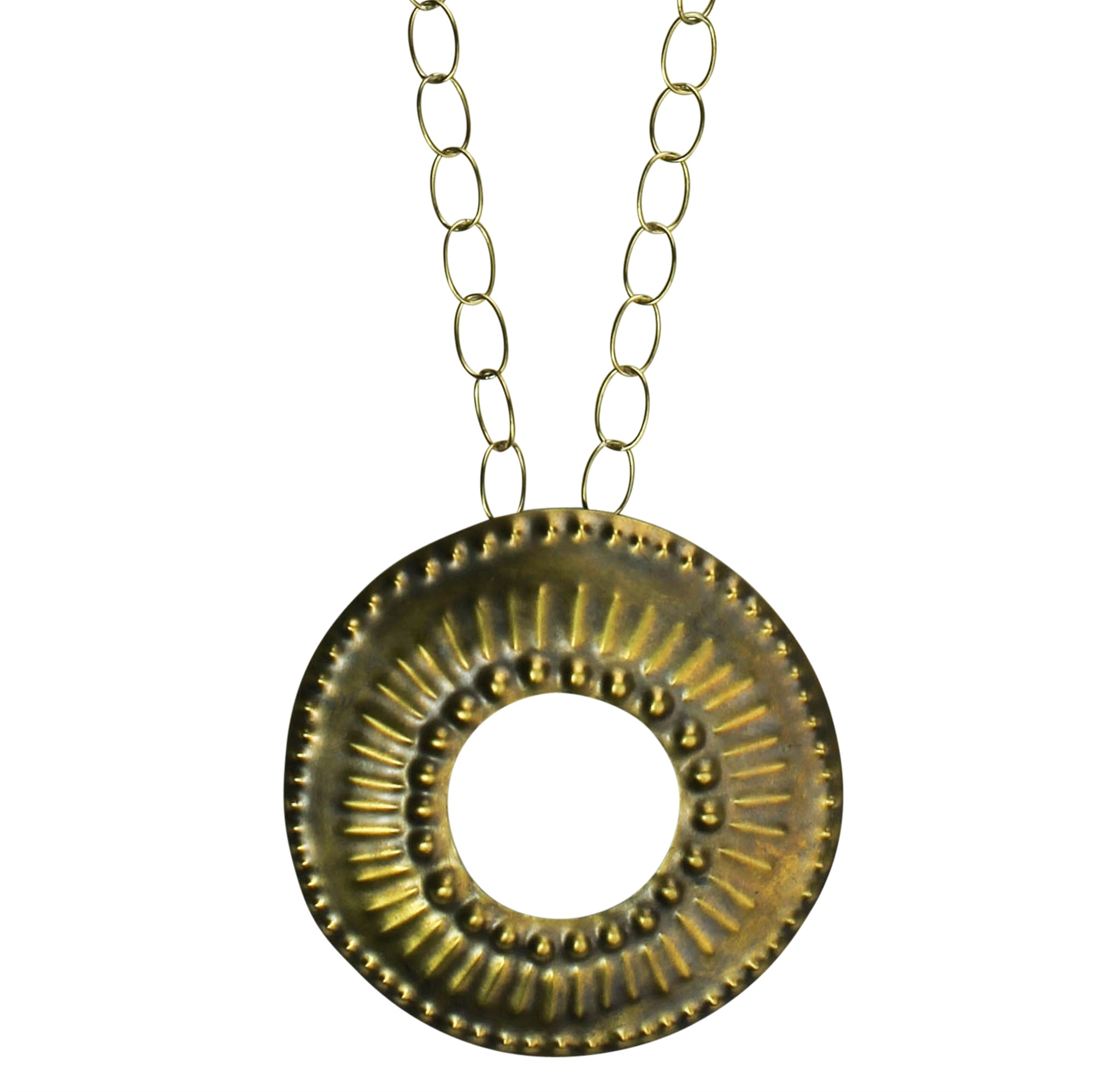 A look that blends Southwest style with tribal aesthetic, the stamping technique on this jewelry creates a pleasing pattern with subtle texture. A versatile collection ready to mix and match. 2.25" pendant on 18" chain