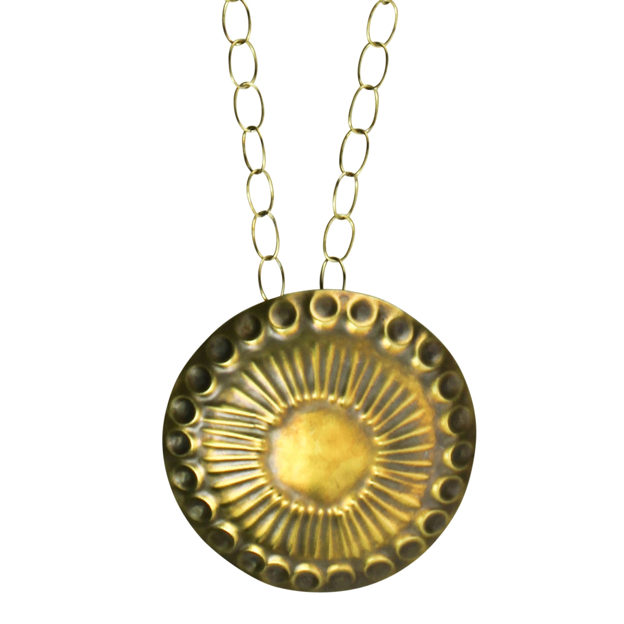 A look that blends Southwest style with tribal aesthetic, the stamping technique on this jewelry creates a pleasing pattern with subtle texture. A versatile collection ready to mix and match. 2.25" pendant on 18" chain