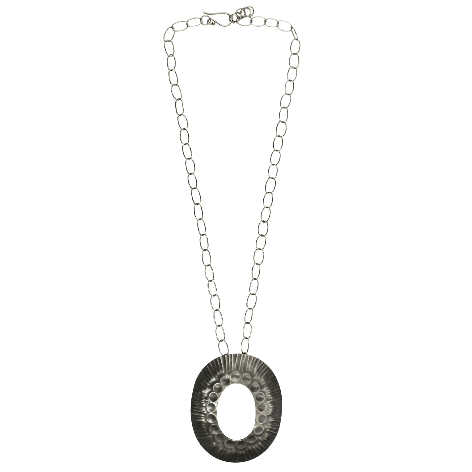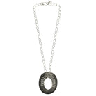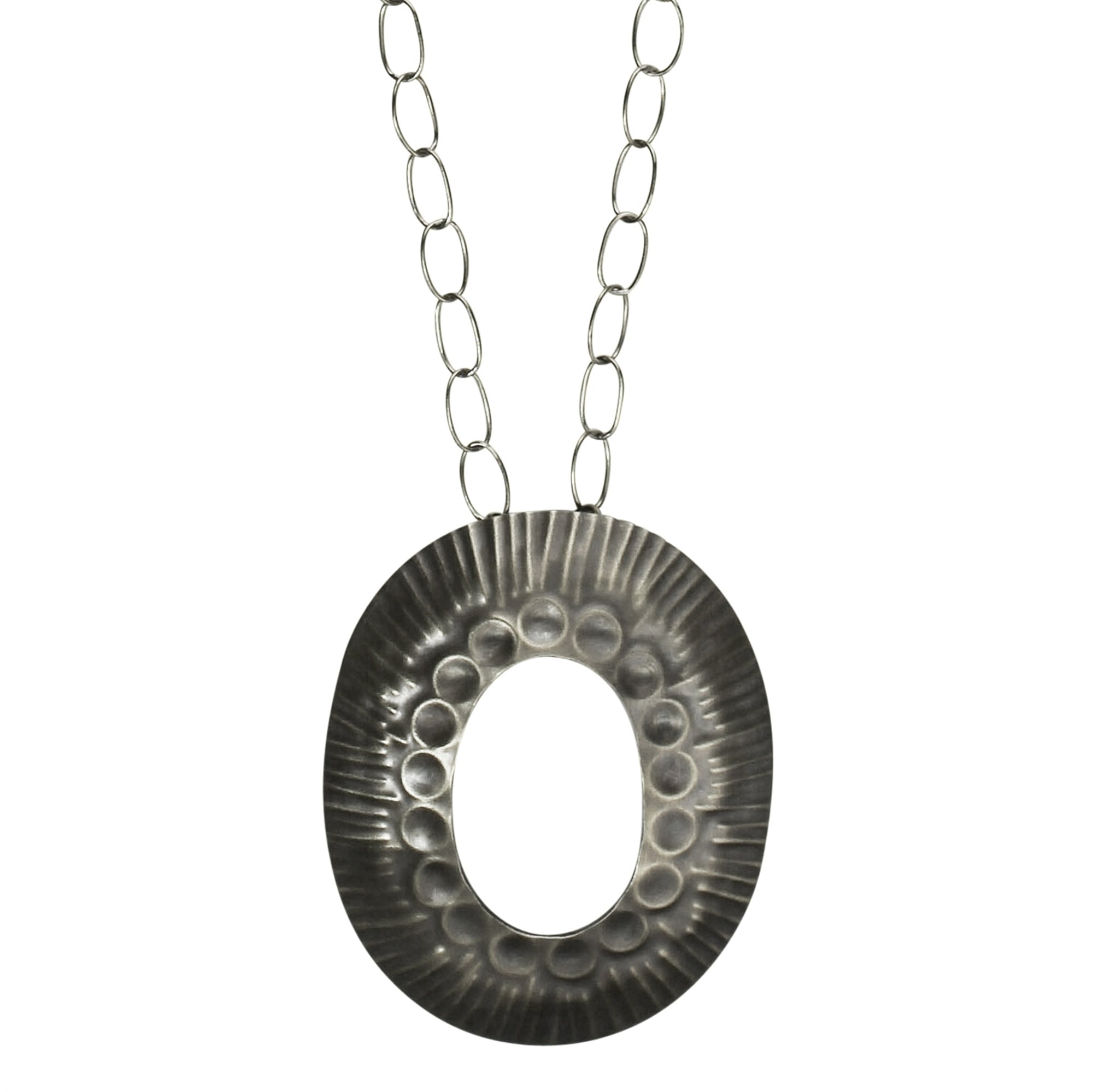 A look that blends Southwest style with tribal aesthetic, the stamping technique on this jewelry creates a pleasing pattern with subtle texture. A versatile collection ready to mix and match. 2.5" pendant on 18" chain. Silver plated.