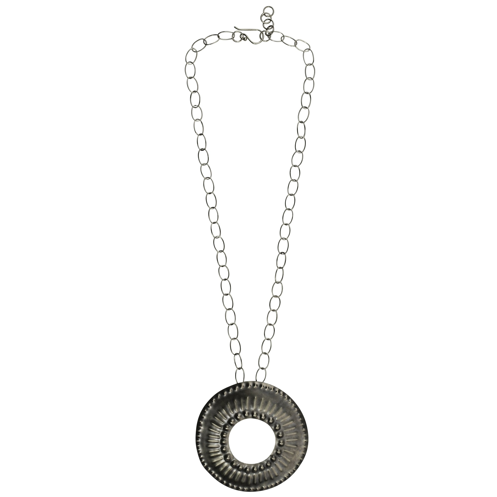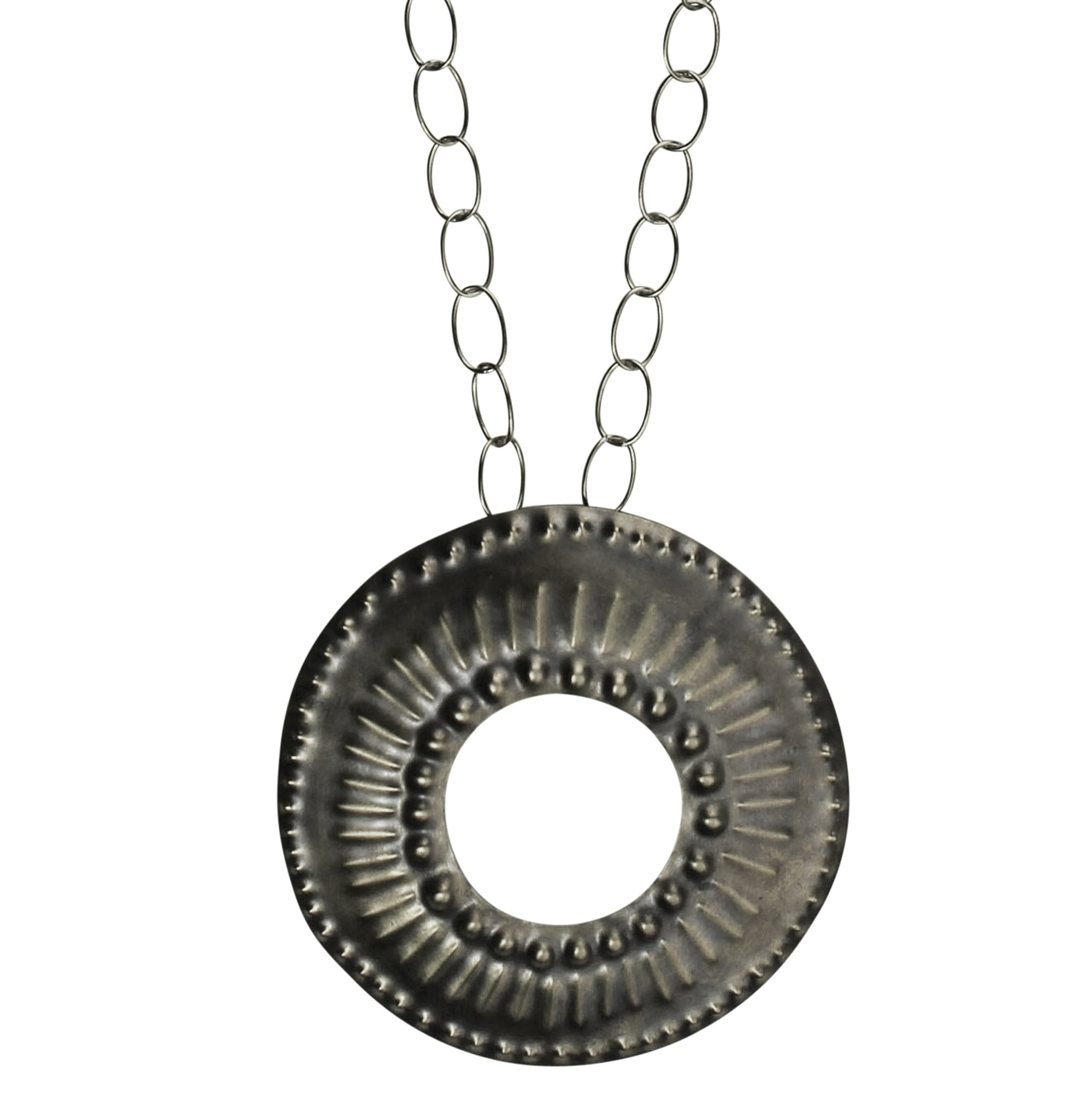 A look that blends Southwest style with tribal aesthetic, the stamping technique on this jewelry creates a pleasing pattern with subtle texture. A versatile collection ready to mix and match. 2.25" pendant on 18" chain. Silver plated.