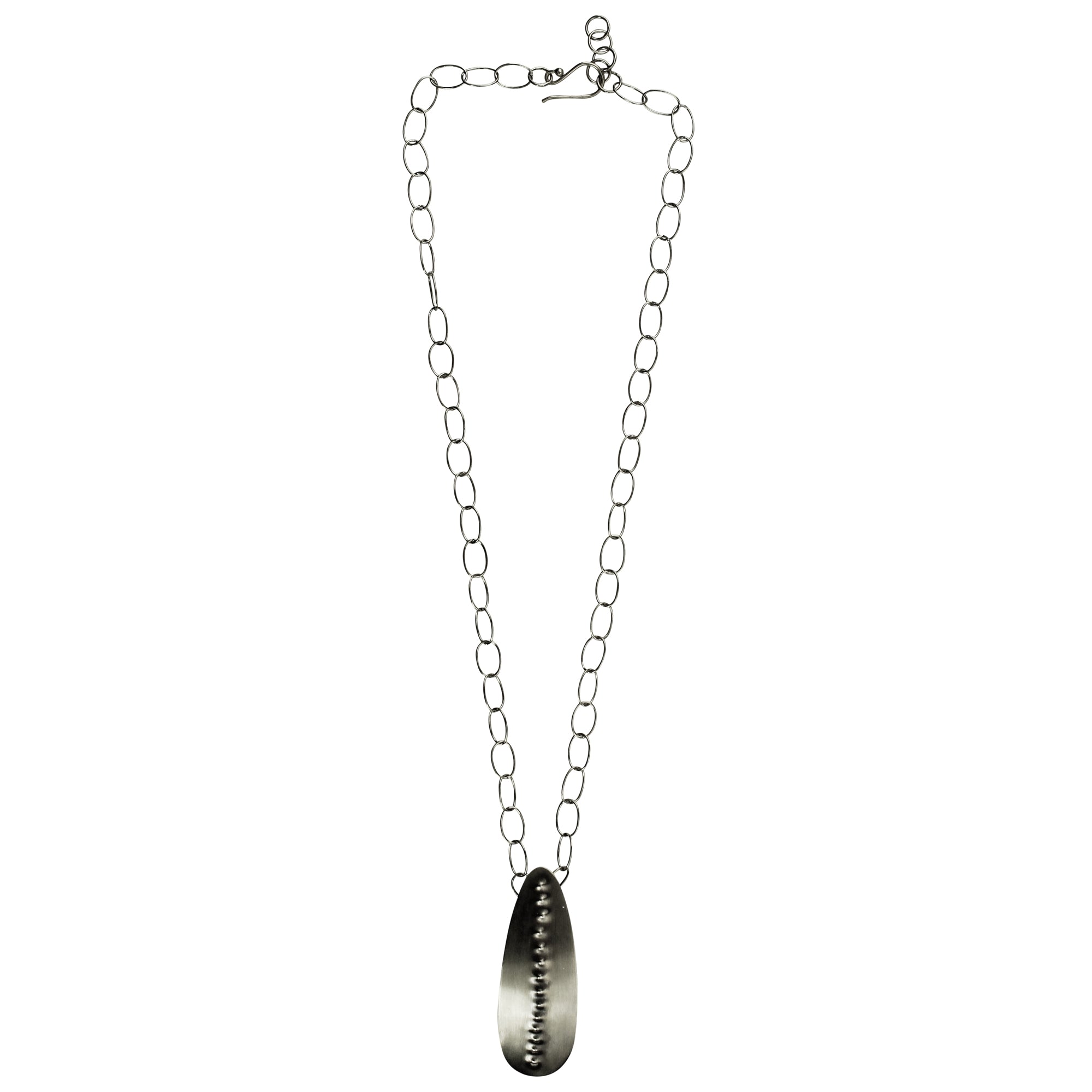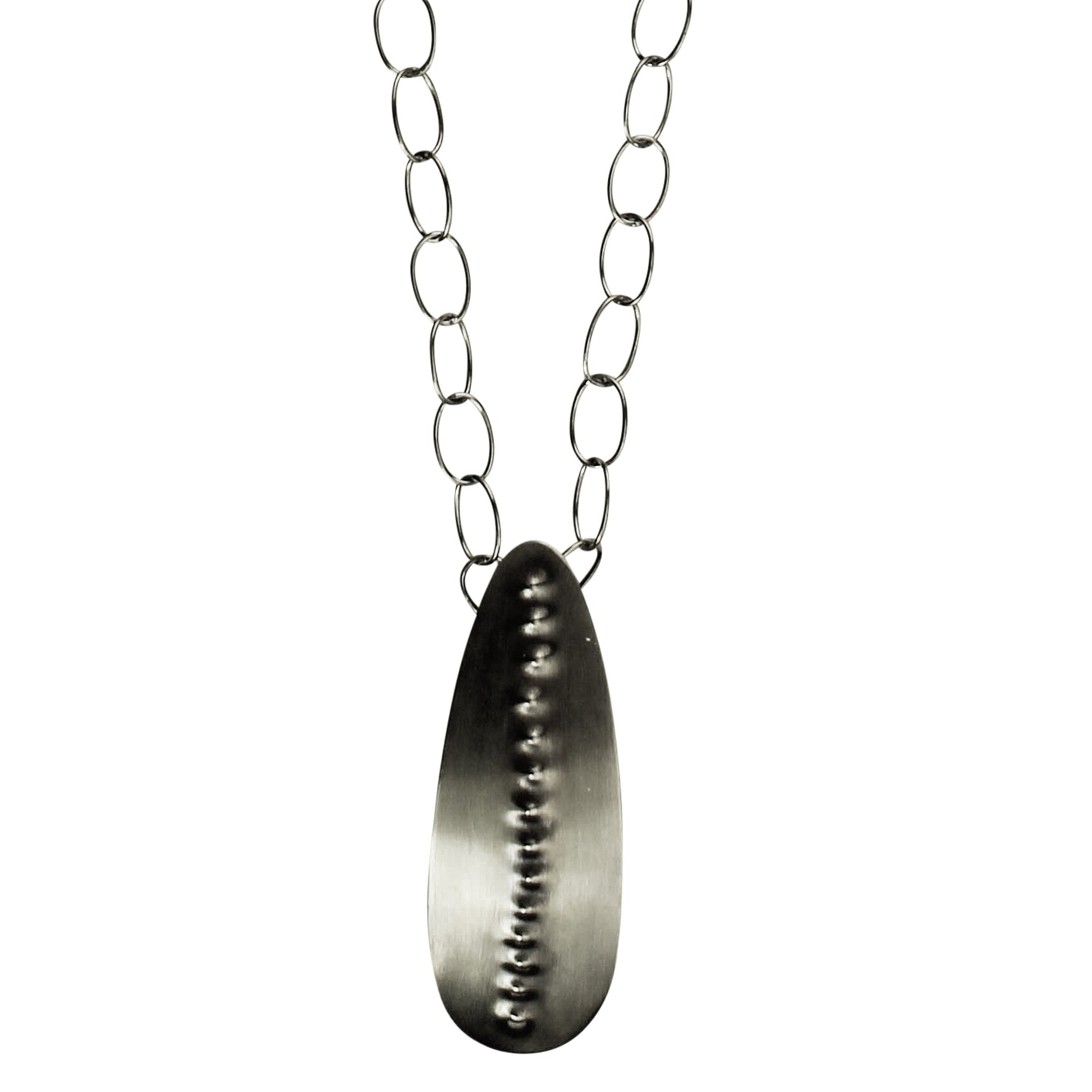A look that blends Southwest style with tribal aesthetic, the stamping technique on this jewelry creates a pleasing pattern with subtle texture. A versatile collection ready to mix and match. 2" pendant on 18" chain. Silver plated.