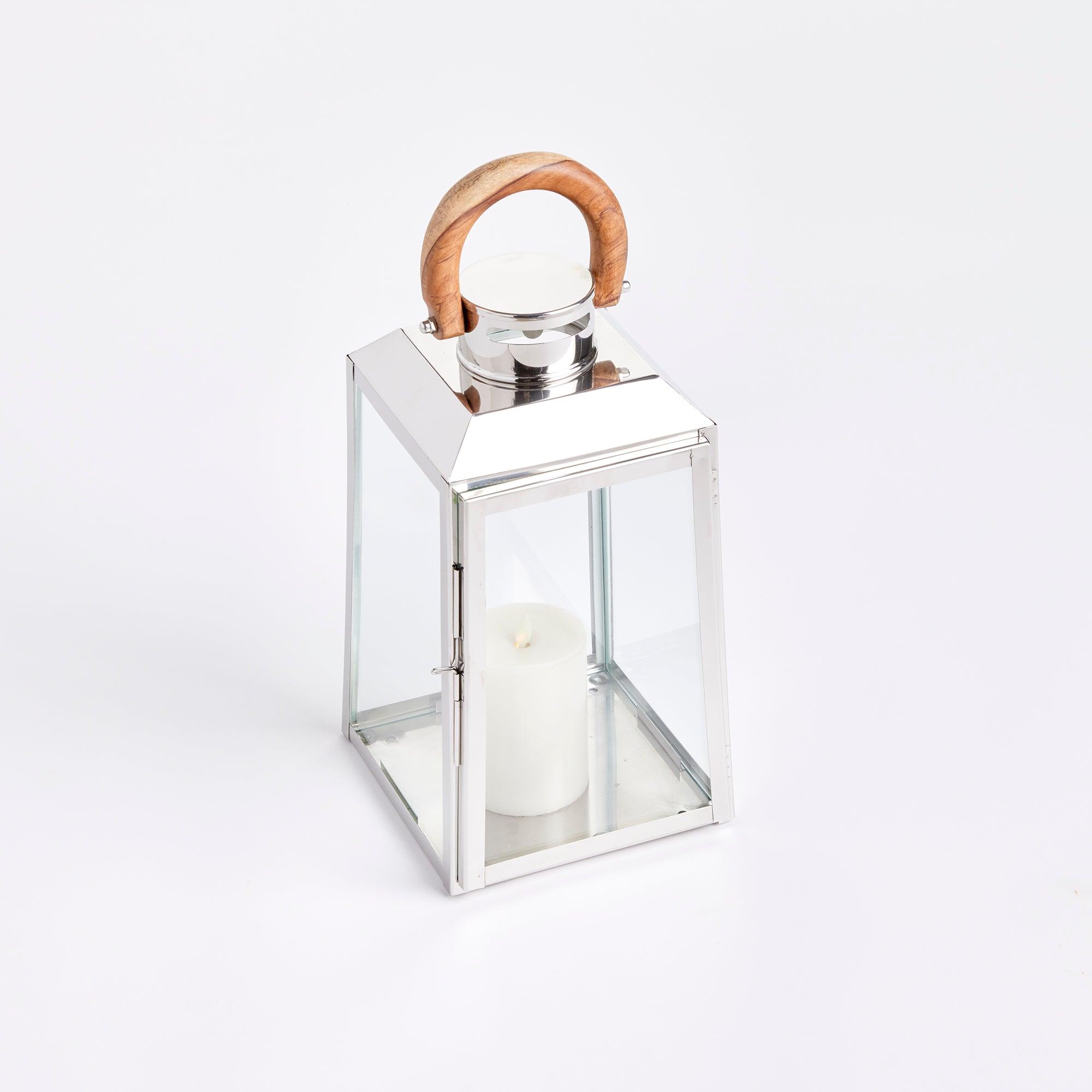 Nautical in style, this handsome outdoor lantern shines brilliantly in a chrome finish and real teak wood handle. Add a couple of pillar candles and it makes a beautiful accent for the front stoop.