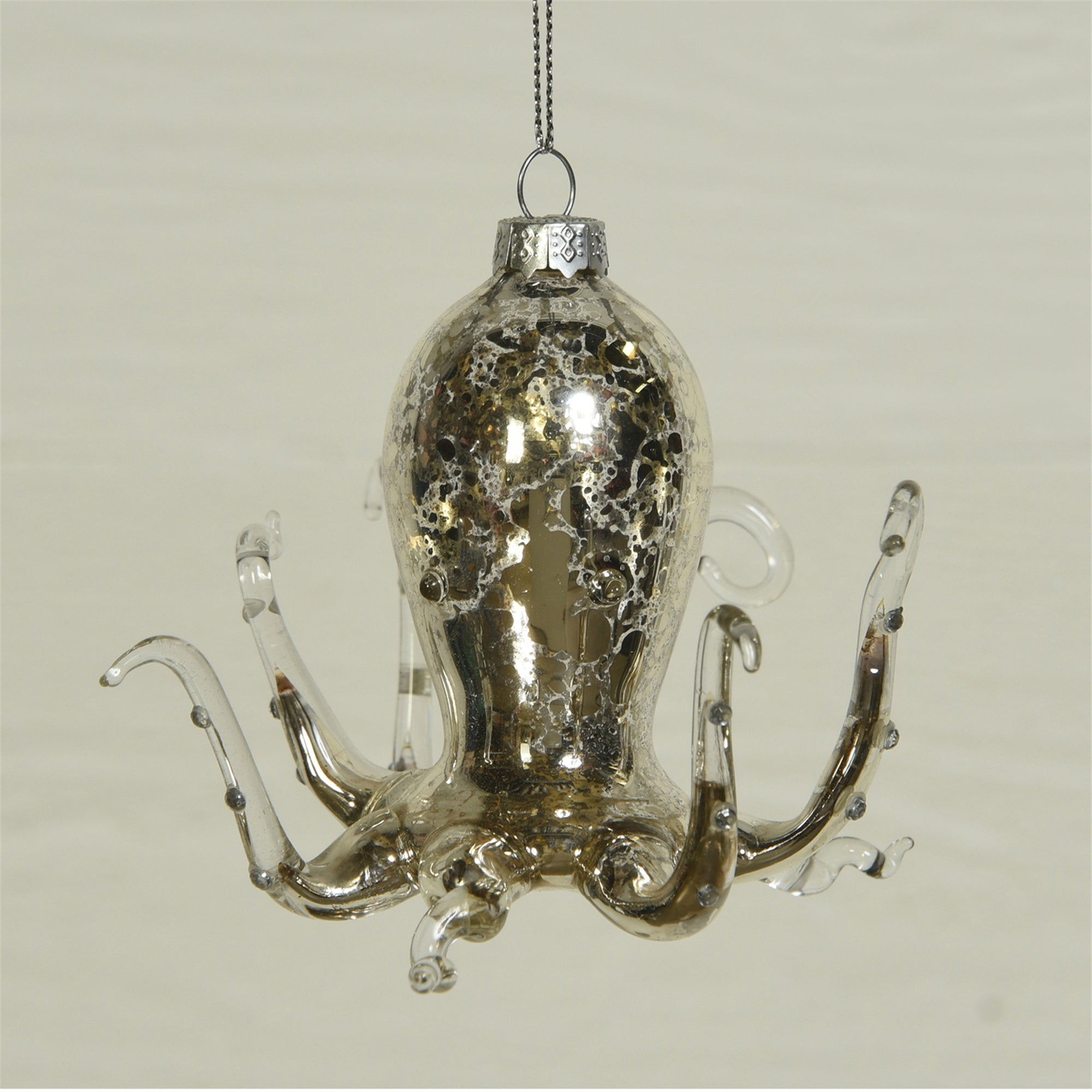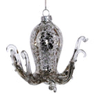 A whimsical silver glass ornament depicts the ever popular octopus to add a unique shimmer to your holidays.