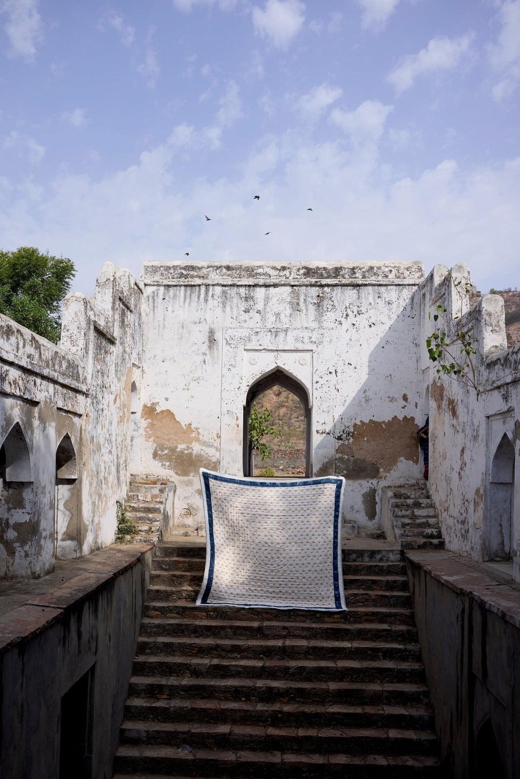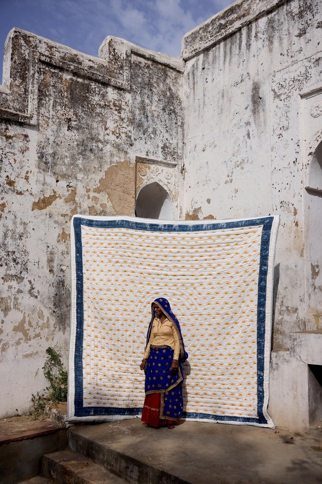 The design is hand-pressed onto each quilt using hand-carved wooden blocks dipped in dyes. The printed cotton shells are brought to the homes of quiltmakers, who stuff and stitch the quilts by hand, creating the final product.