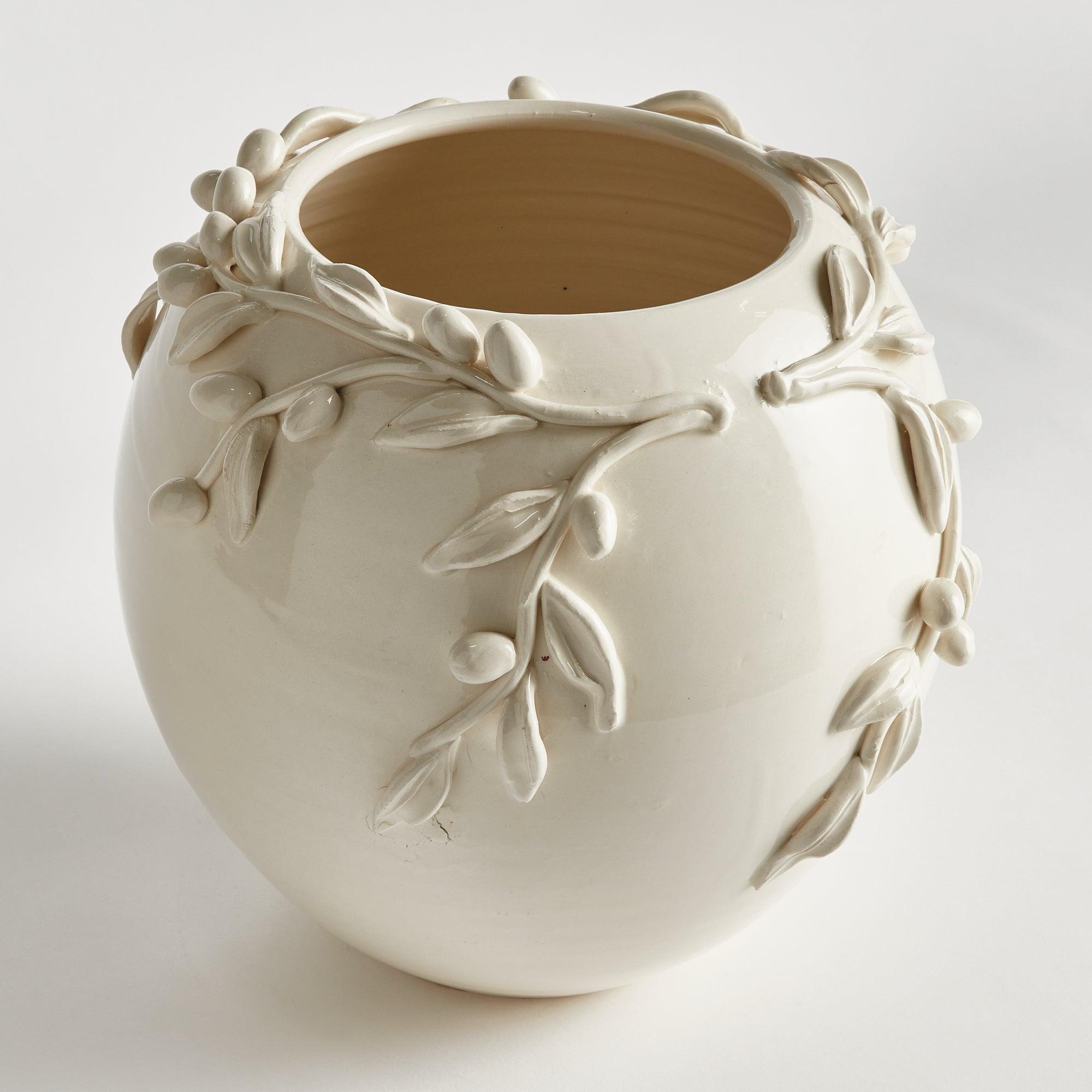 Each and every distinctive olive detail of the Olivella Vase is handmade, and hand-applied by Italian artisans in Tuscany. A classic design in a soft white glaze. With an extraordinary craftsmanship passed down through generations, each piece is a true original. In grand scale, a dynamic centerpiece for feature table, kitchen island or mantel.