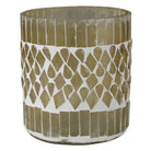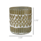 Glass pieces are hand cut and laid into intricate patterns then offset by a white grout in our updated take on mosaic. Lustrous with a candle or stellar with floral.