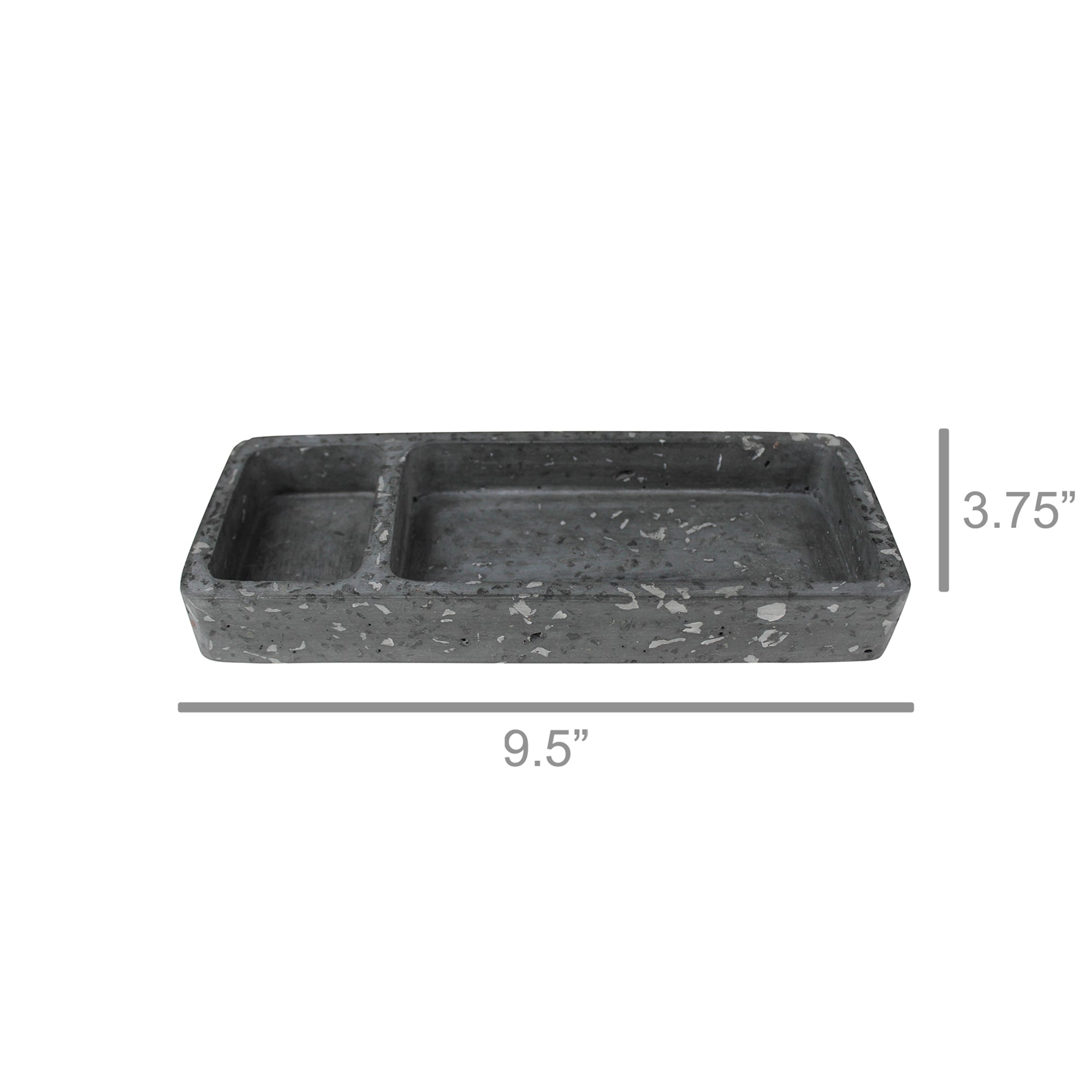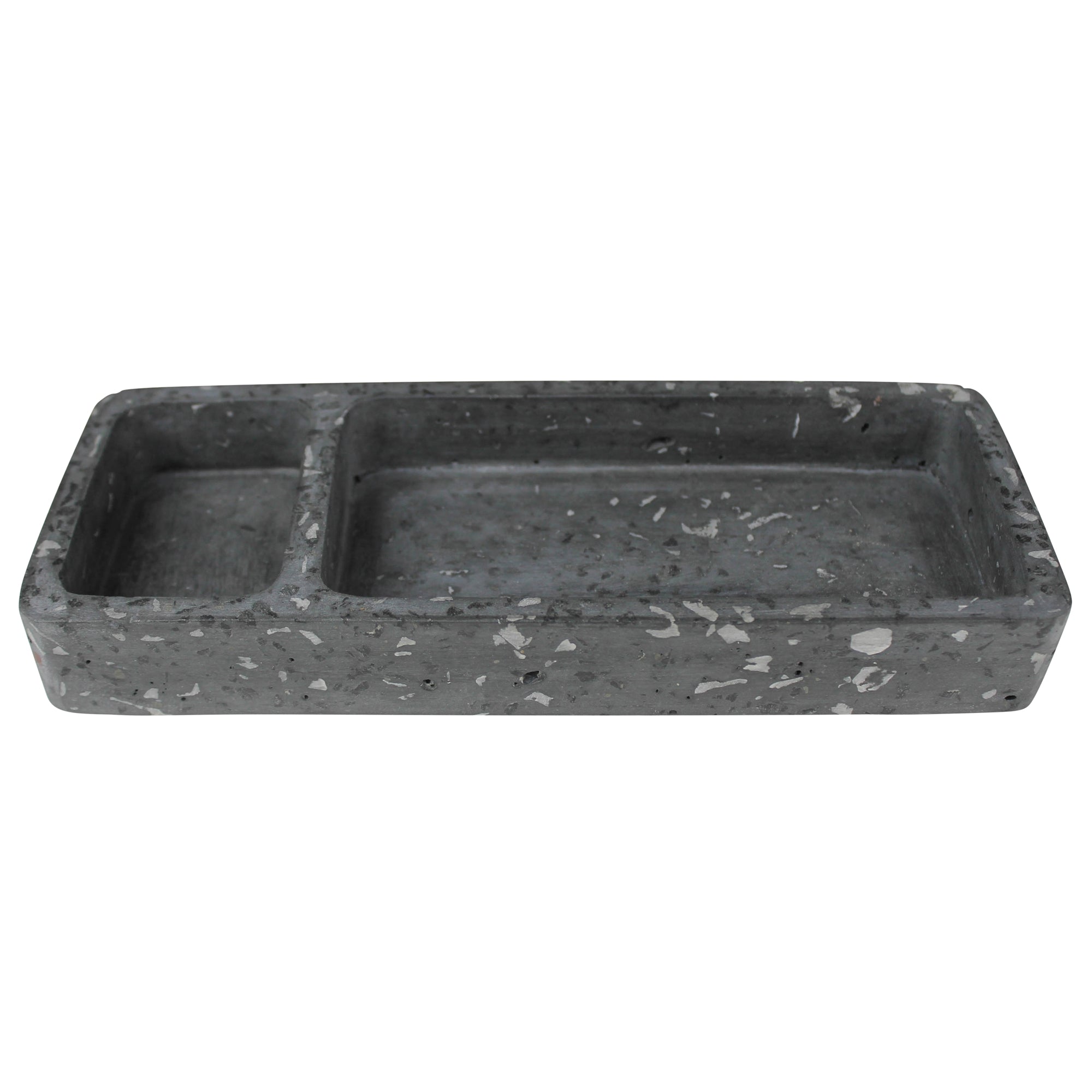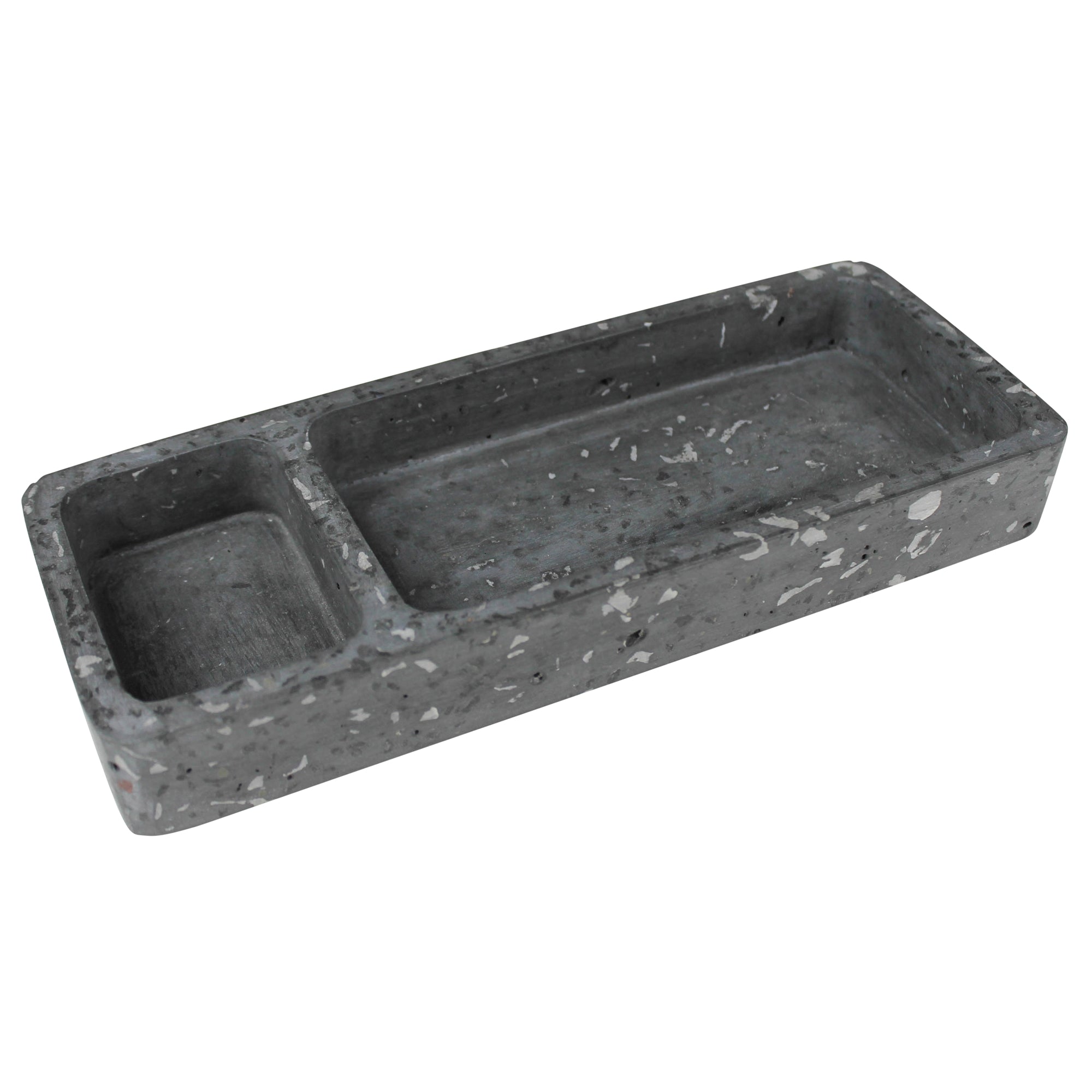 Fun, confetti like specs of marble and quartz pop through the smooth cement form of this terrazzo tray offering a happy place to organize desk supplies. For decorative use only.