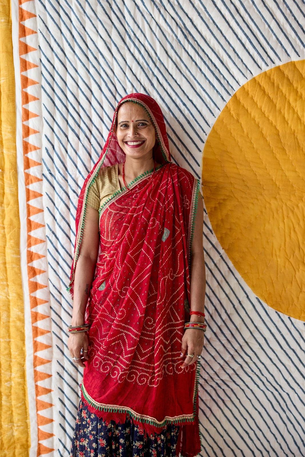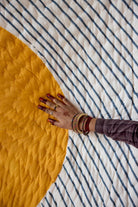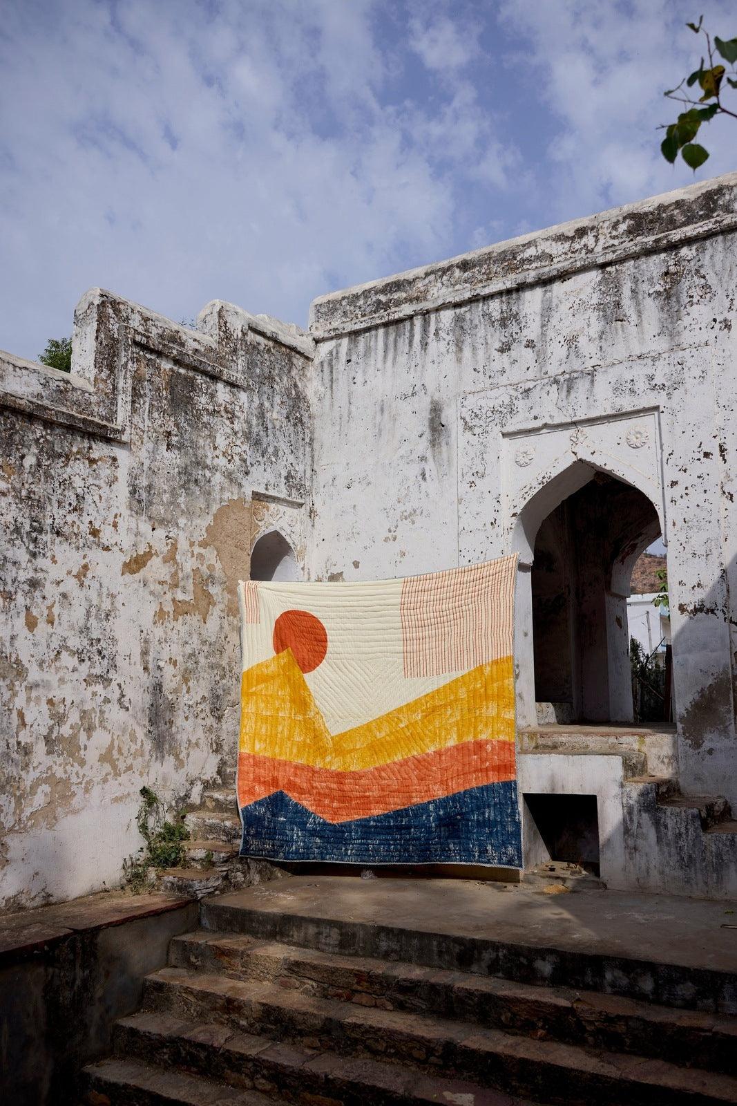 The design is hand-pressed onto each quilt using hand-carved wooden blocks dipped in dyes. The printed cotton shells are brought to the homes of quiltmakers, who stuff and stitch the quilts by hand, creating the final product.