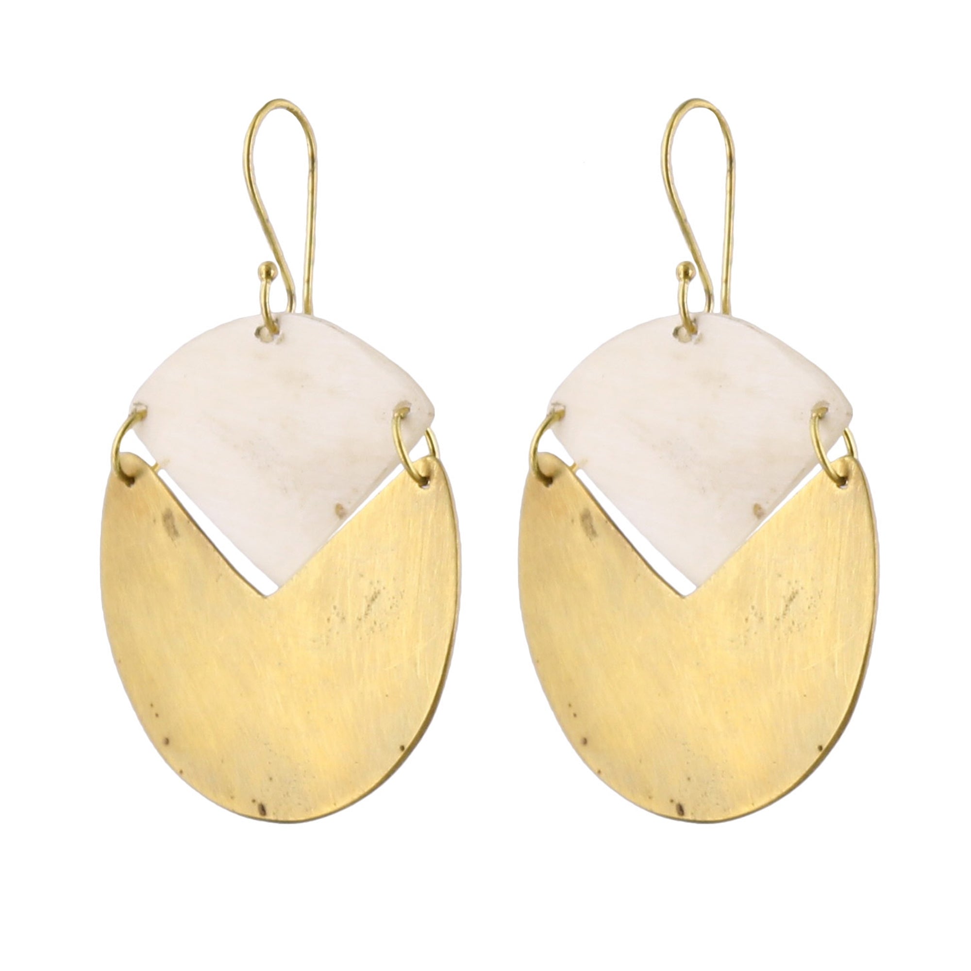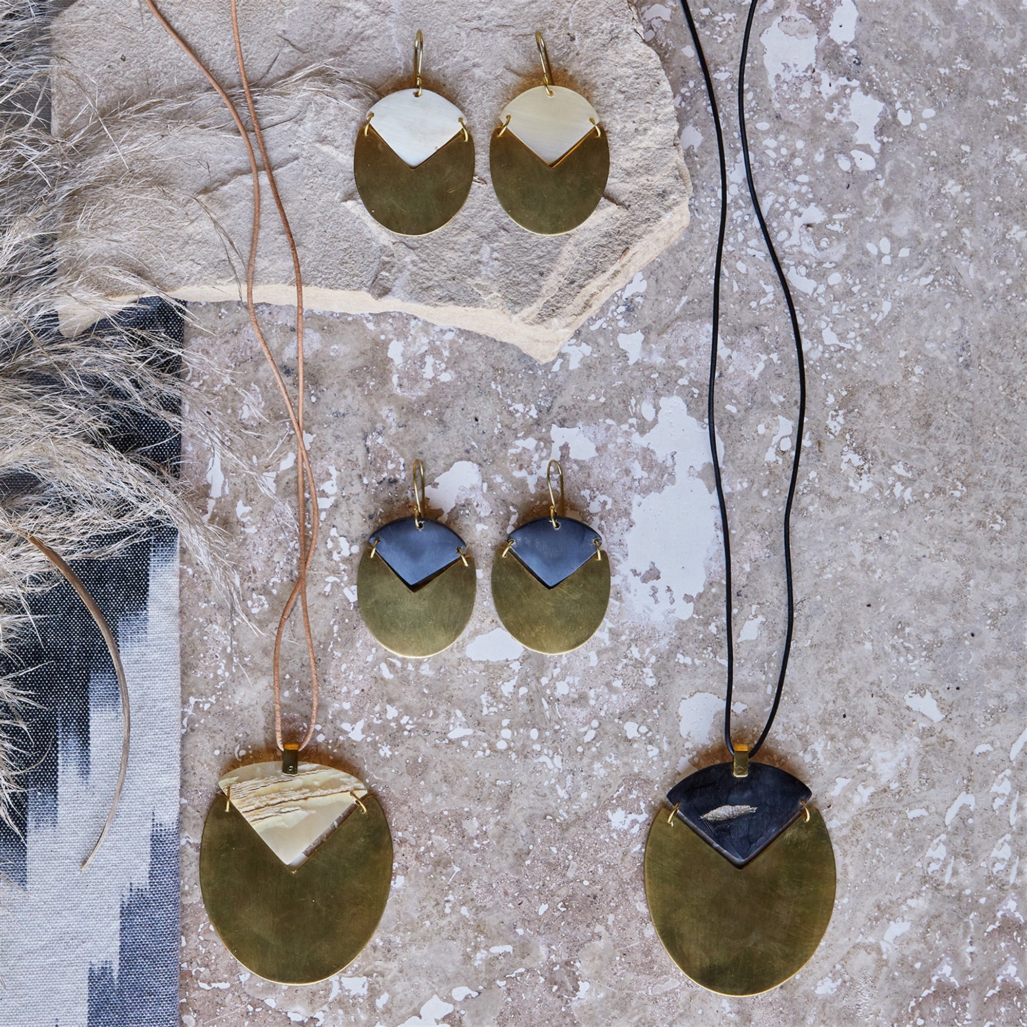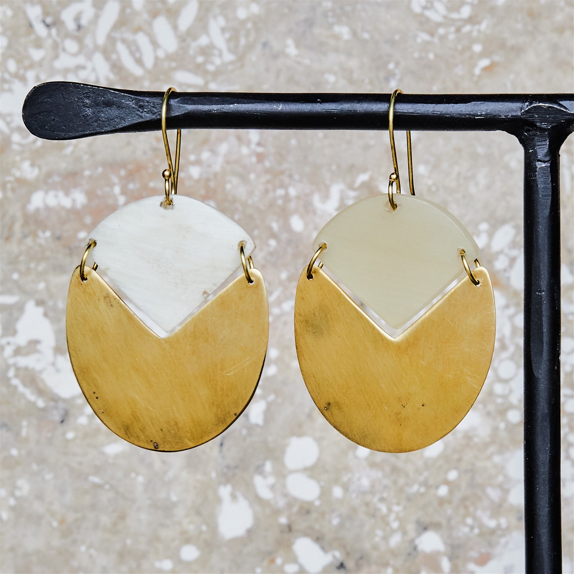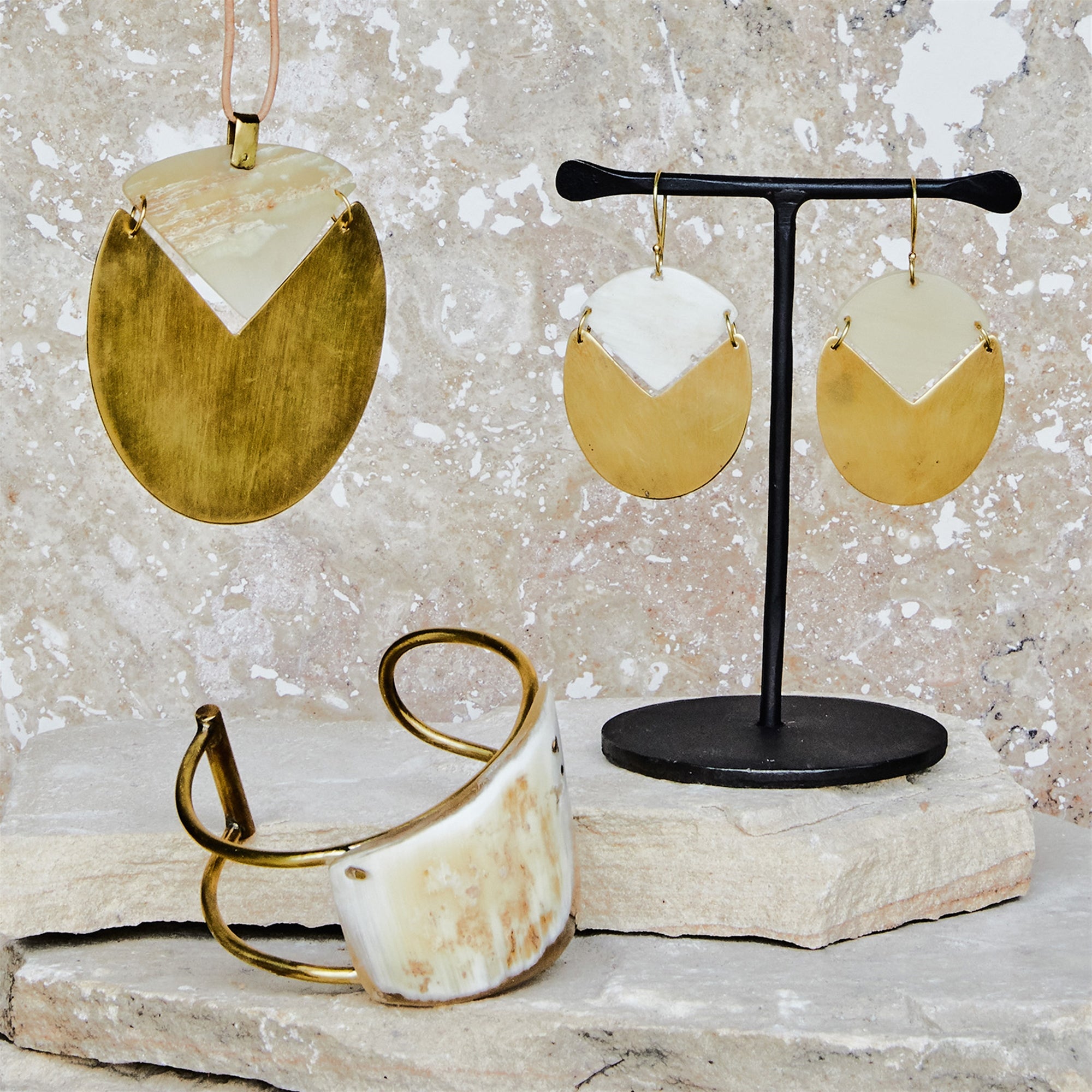 Wedges of horn and ovals of brass are linked to create fluid forms with graceful movement. 1.5"x2.25"
