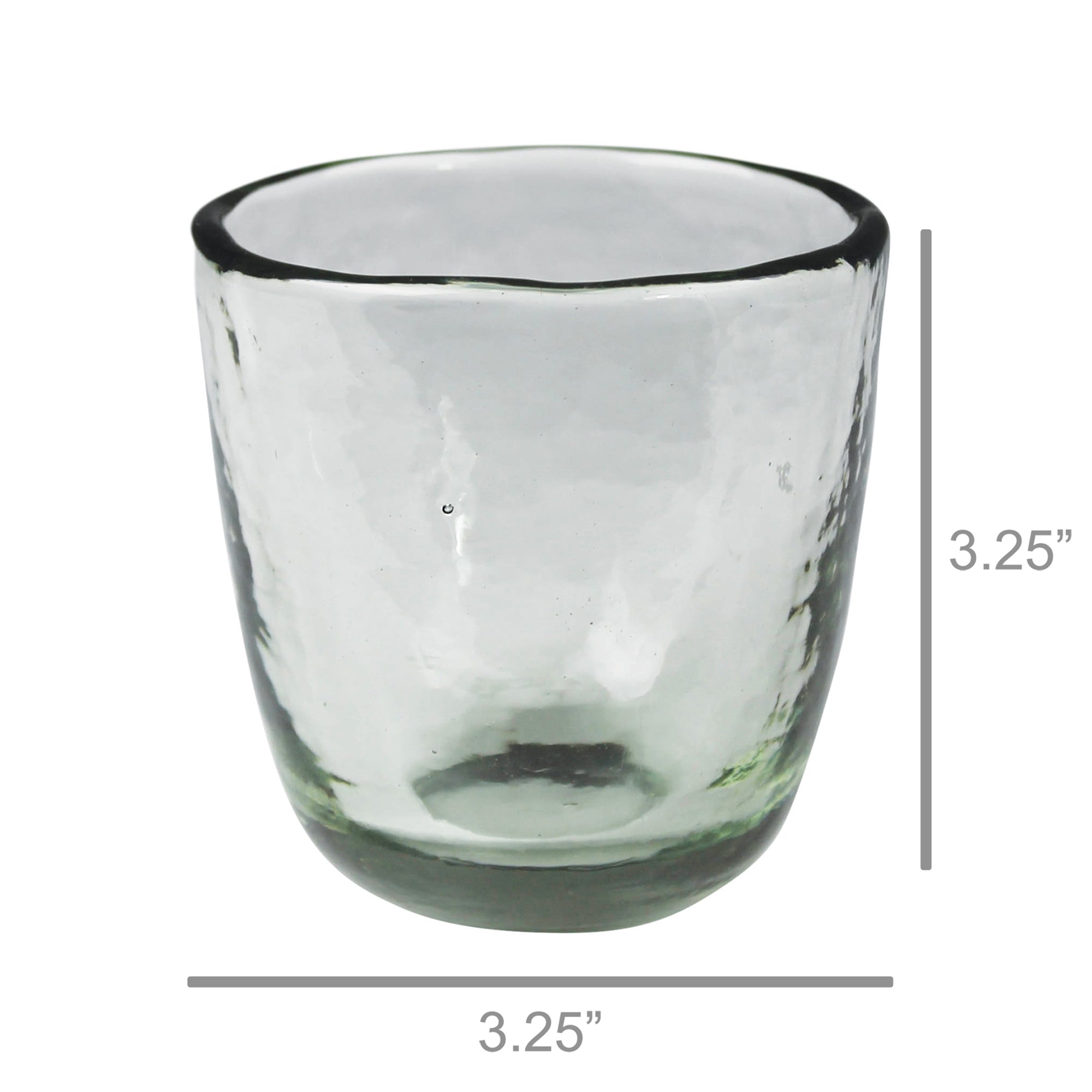This casual glassware collection is hand made of recycled glass lending a unique characteristic to each piece. Thick glass with a subtle hammered texture, this fuss-free drinkware feels as good in the hand as it looks on a shelf. 6 oz capacity