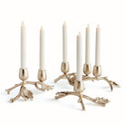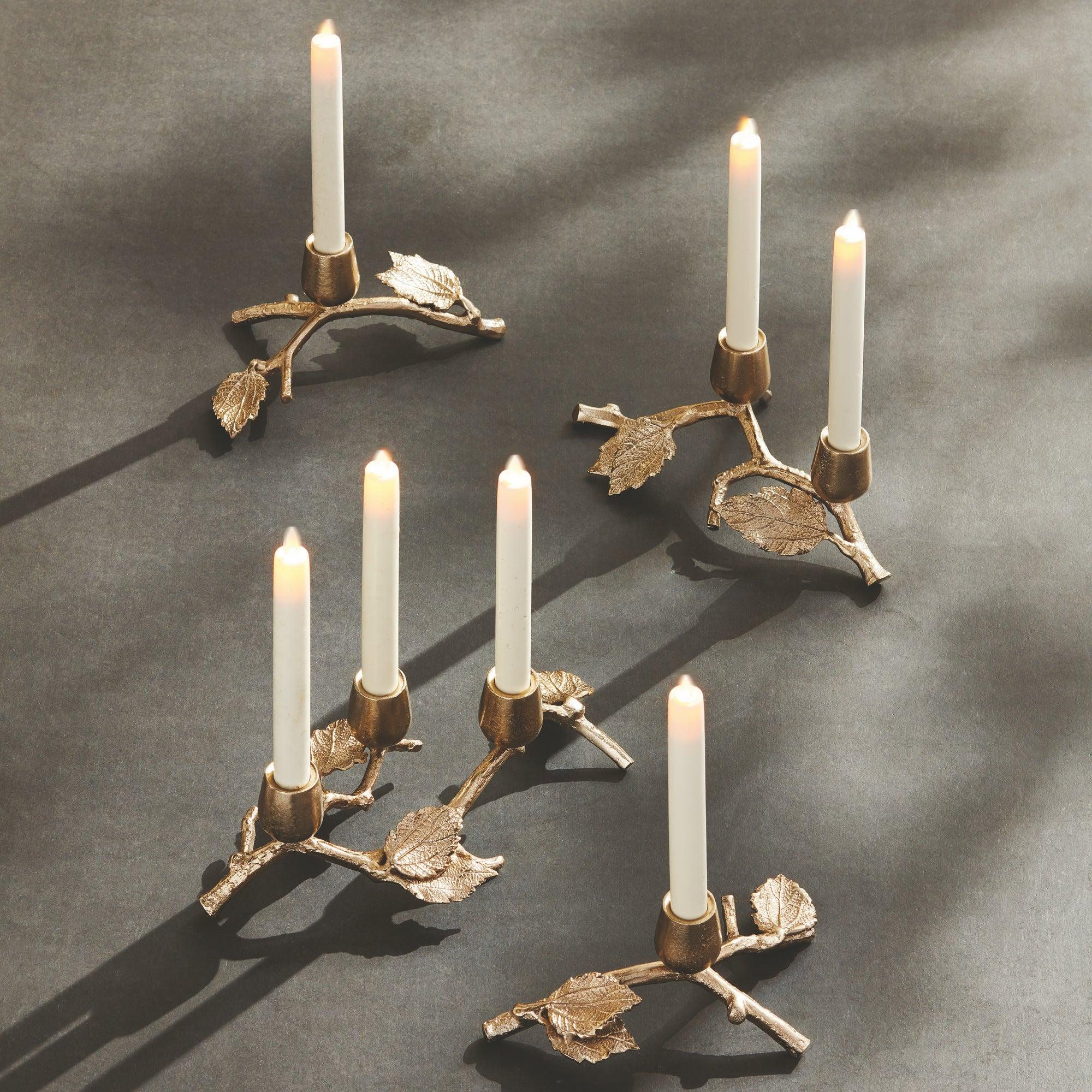 Made from hand-sculpted molds in solid cast aluminum, these nature-inspired branch and leaves taper holders in champagne gold are a substantial accent. Paired with any style taper candles, they make a stunning centerpiece.