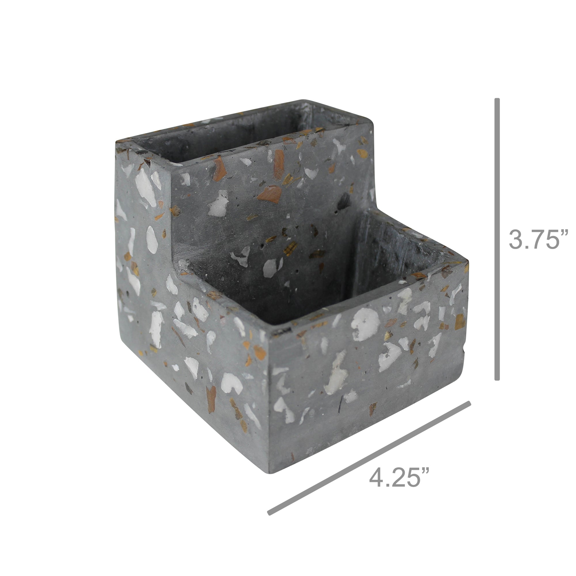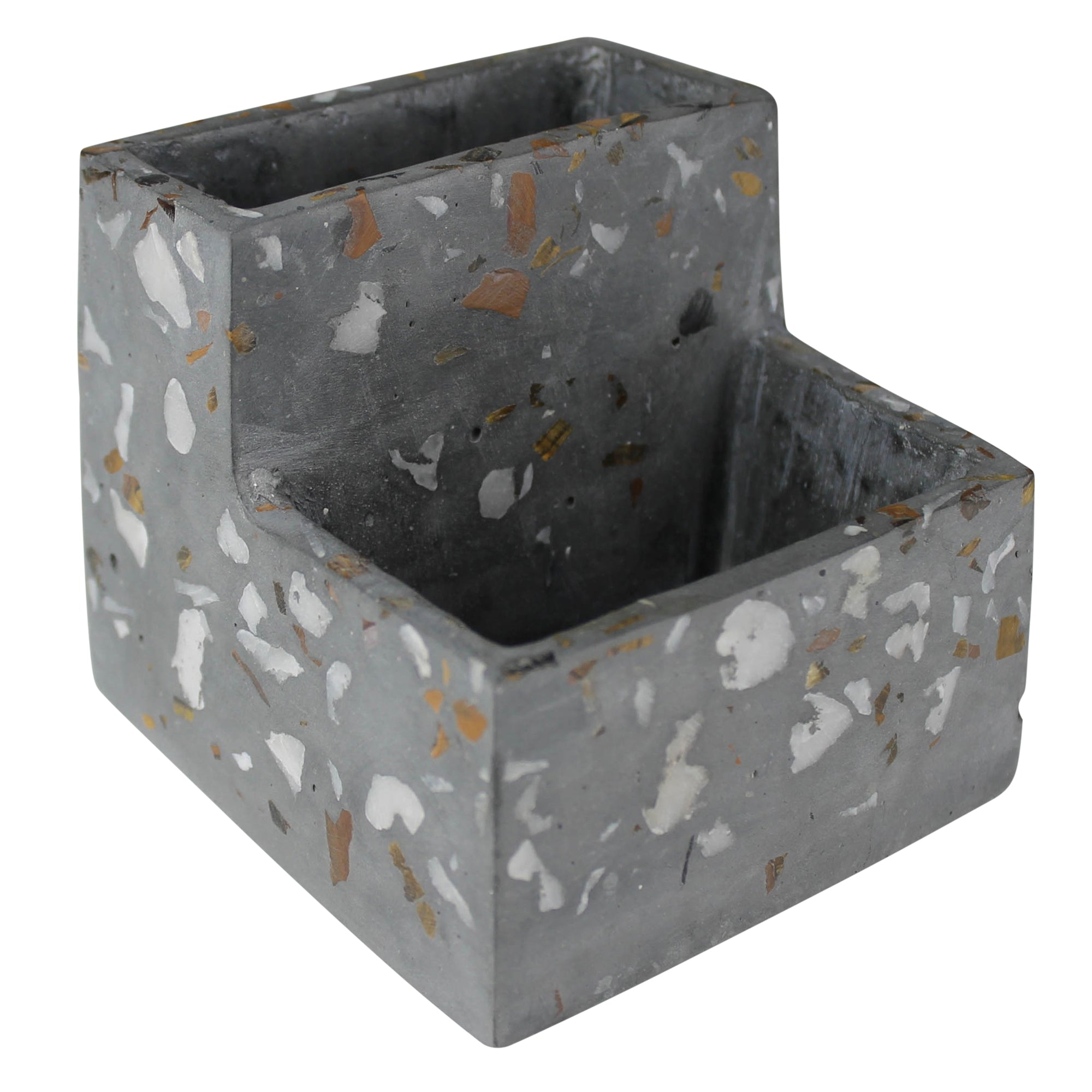Fun, confetti like specs of marble and quartz pop through the smooth cement form of this terrazzo vessel creating a happy place for pens and pencils. Make it even more fun by adding a plant into the mix. For decorative use only.