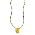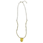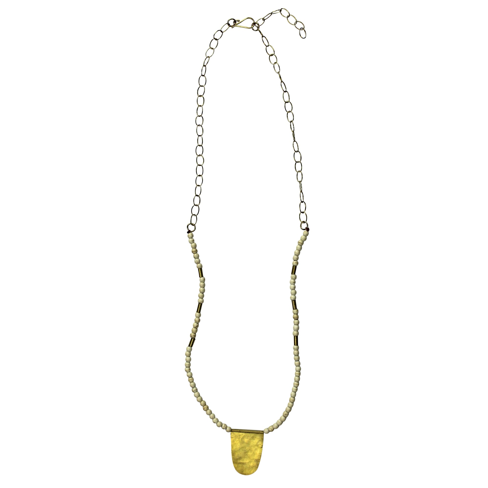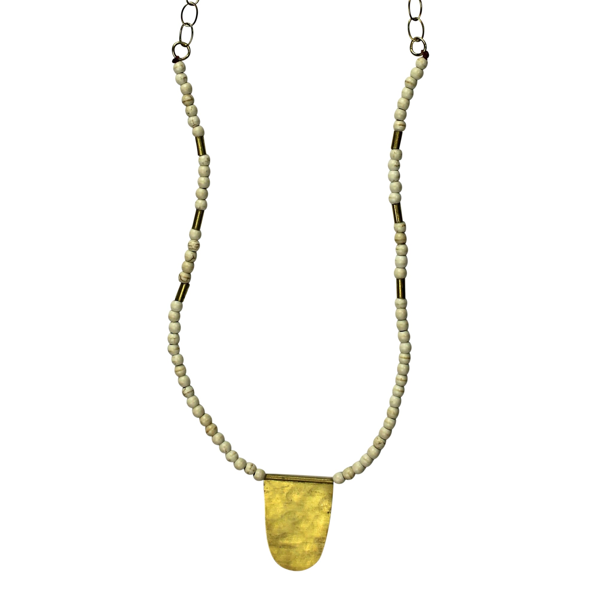 Step into bold style with our handmade Brass Necklace, showcasing howlite beads and a striking brass arch. Perfect for making a statement with artisanal flair. 1.25" pendant on 24" beaded strand, adjustable