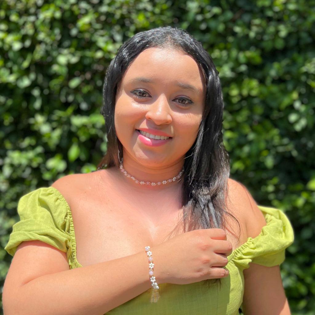 Renaissance inspiration is forefront for fall this season and the Penelope bracelet style is perfectly on trend. Pearlescent seed beads and gold plated beads are intricately formed and strung together, and in the center of the bracelet, three pale pink faceted crystals are surrounded by gold plated spacers and placed between the white flowers to create your new favorite bracelet. 6 1/2 inches with a lobster clasp and 1 1/2 inch extender.