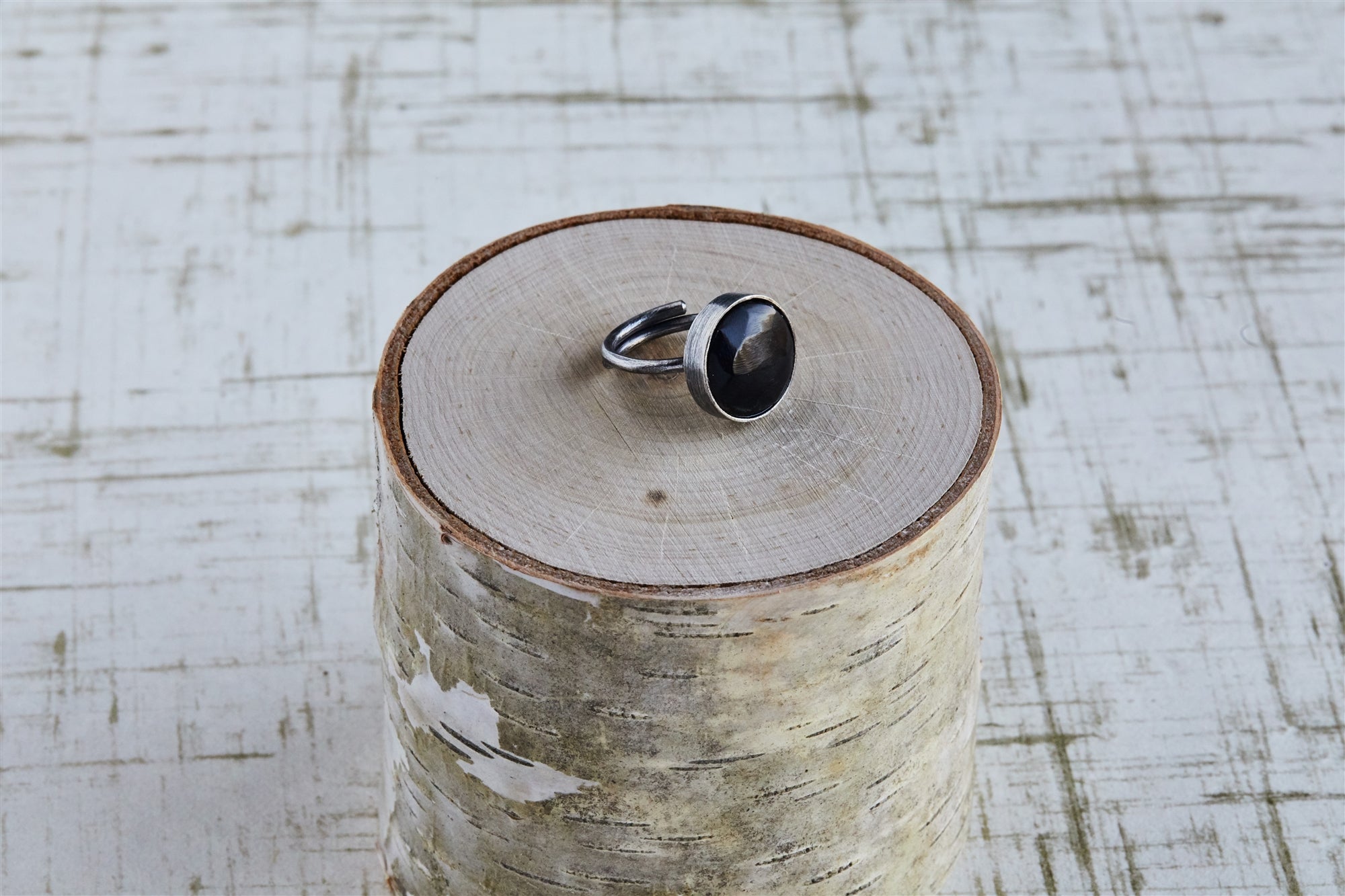 Natural materials - Brass and Horn - are sourced from the land and are bezel set onto an adjustable ring. Silver-plated.