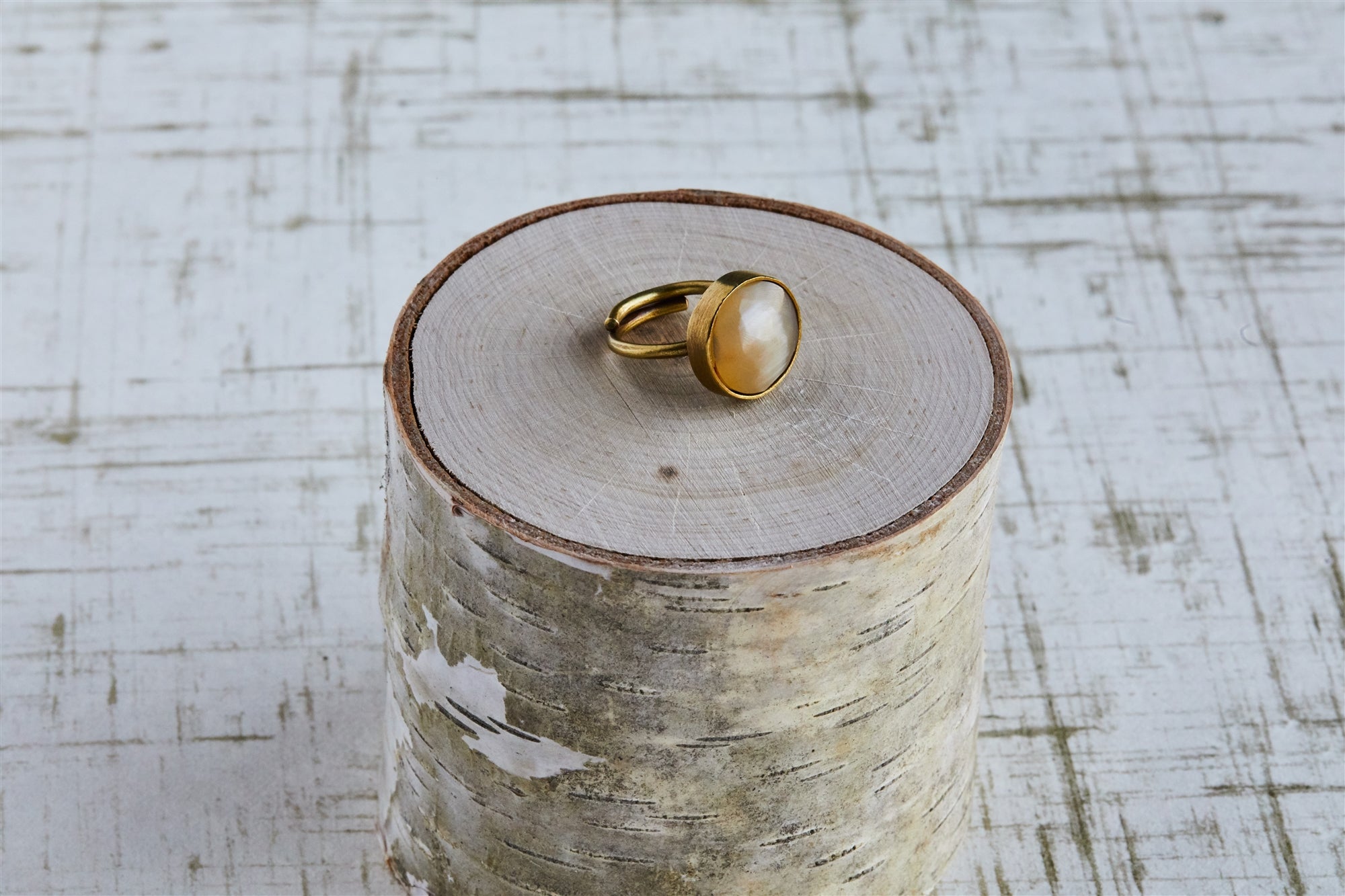 Natural materials - Brass and Horn - are sourced from the land and are bezel set onto an adjustable ring.
