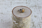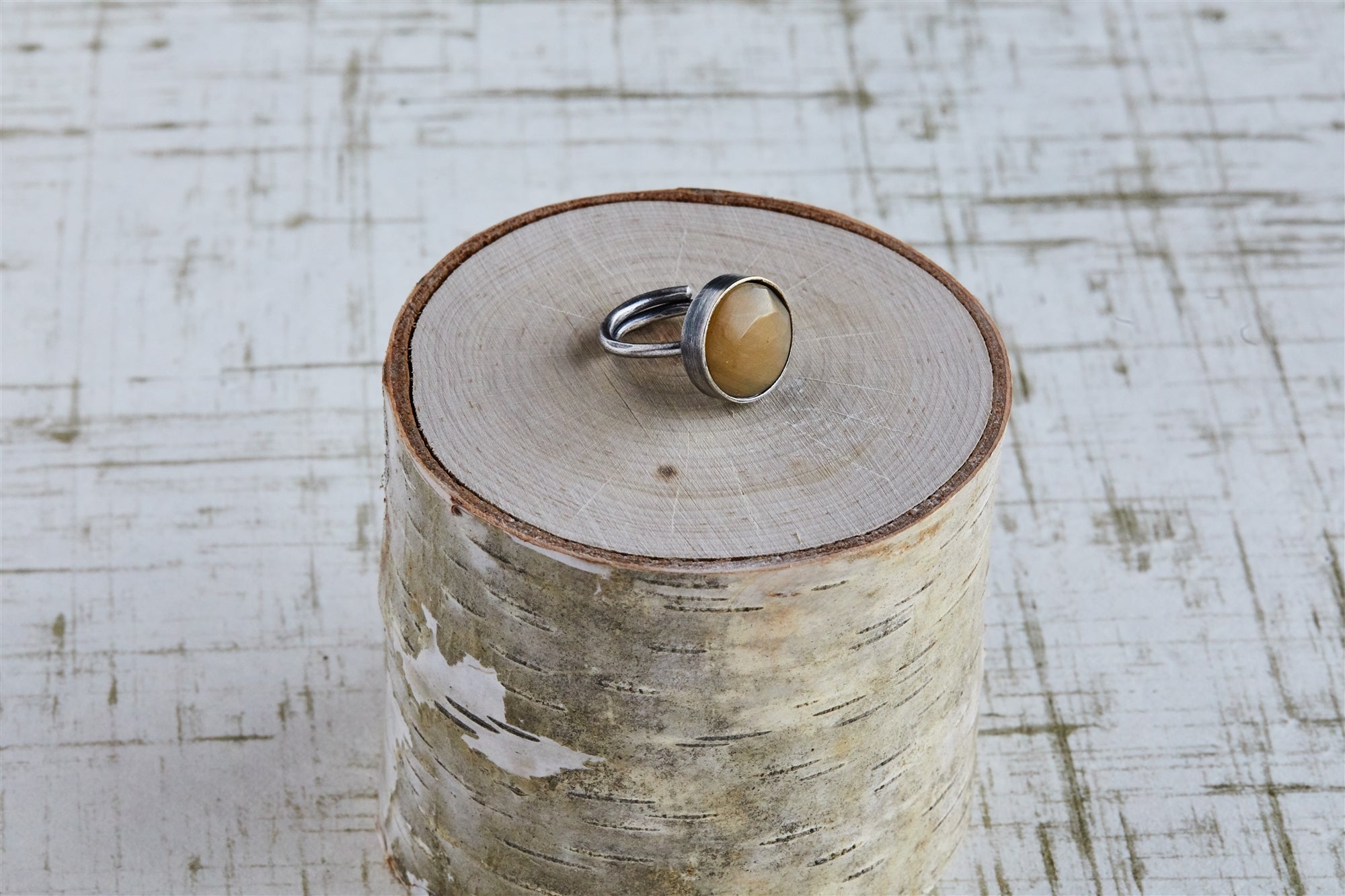 Natural materials - Brass and Horn - are sourced from the land and are bezel set onto an adjustable ring. Silver-plated.