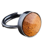 Natural materials - Brass and Wood - are sourced from the land and are bezel set onto an adjustable ring. Silver-plated.