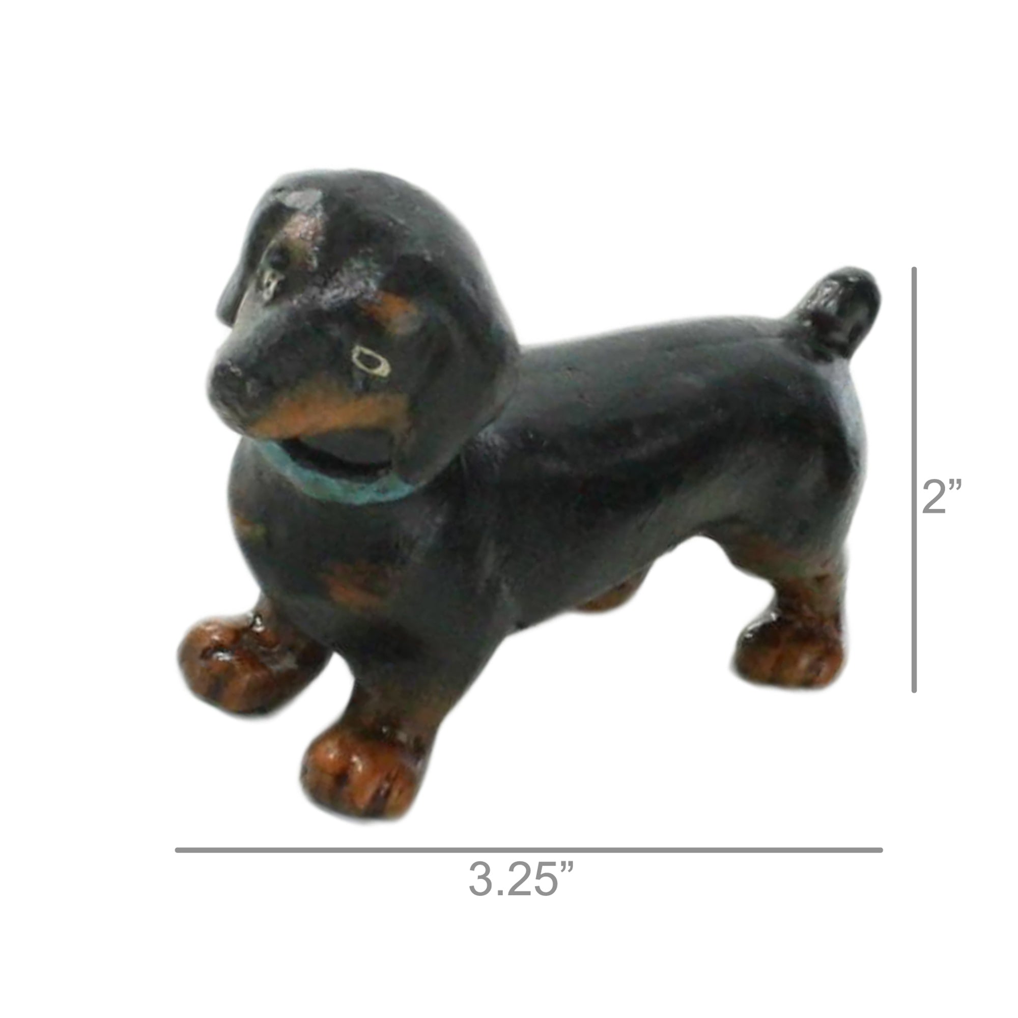 Penny the Dachshund is cast iron, hand painted and distressed for a vintage inspired look. Wipe with dry cloth