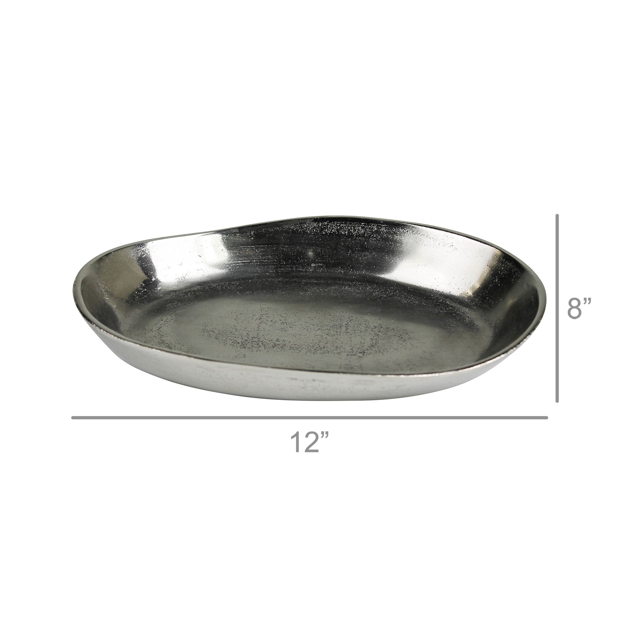 Cast of aluminum and plated in nickel the organic shape of this low oval bowl is fit to flaunt anything from ornamental objects to fanciful fruit.