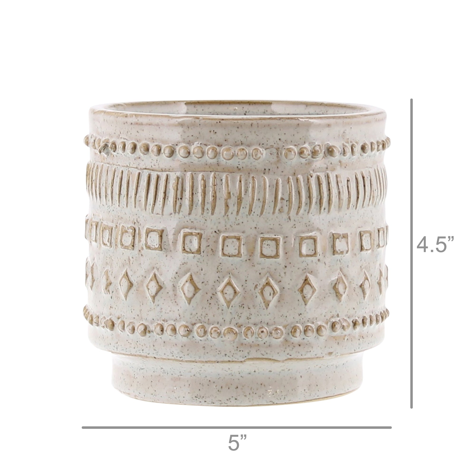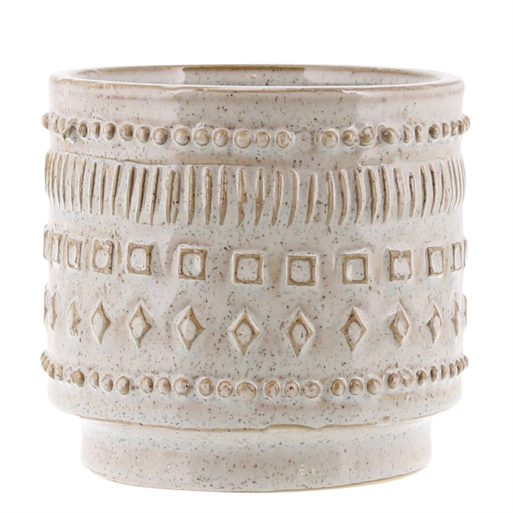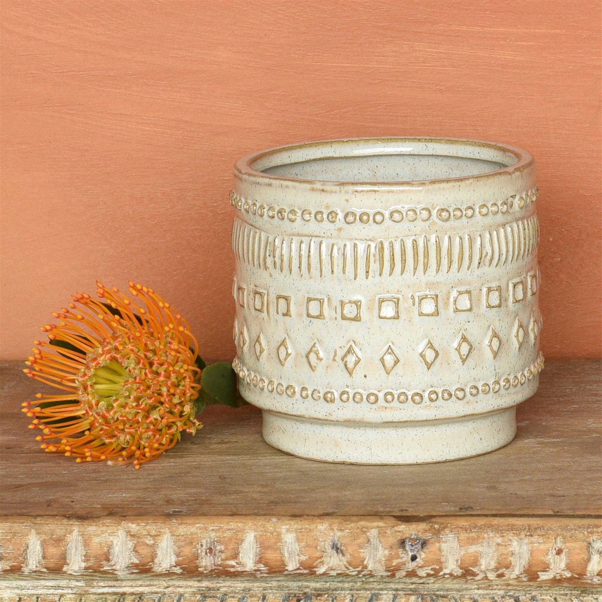 The undulating embossed patterns of this ceramic cachepot is reminiscent of South American craft and the creamy white glaze adds just the right amount of sheen to bring the pattern to life.