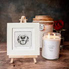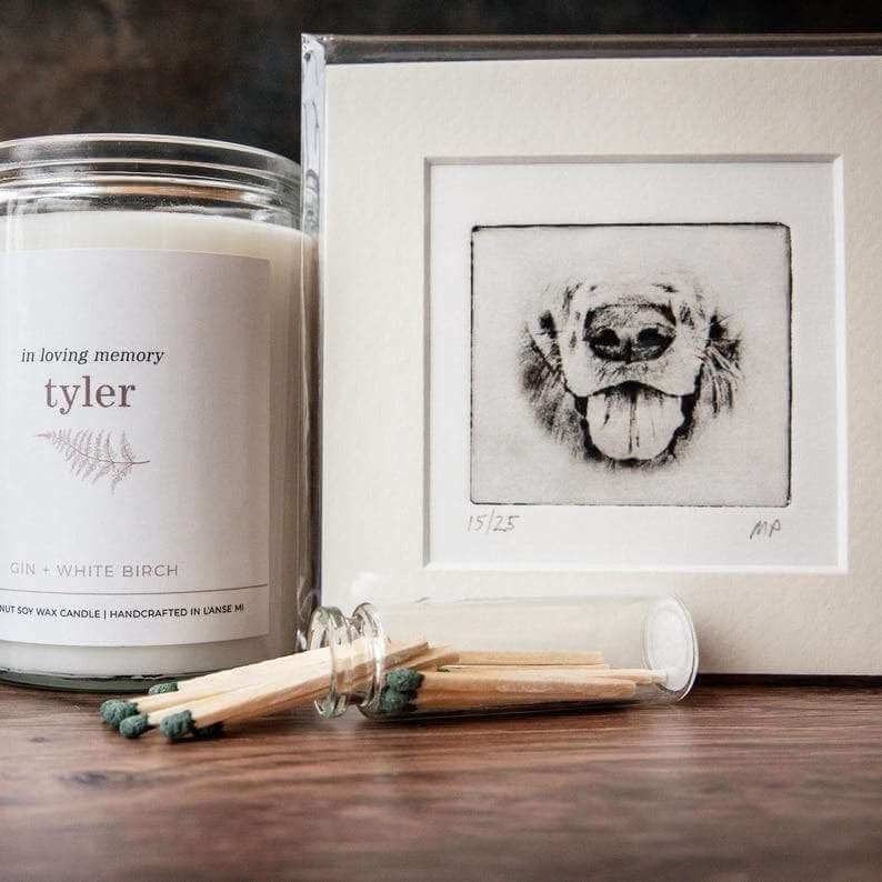 INFO: Use this customized candle and handmade etched pet portrait as part of a memorial ceremony to help ease the pain of losing a beloved pet, or simply place the candle and etching next to a favorite photo, urn, or pet collar. All custom pet portrait etchings are handcrafted by Califonian artisan, Mandi, at Greyboy Pet Prints and come matted. I will email you to ask you to email me some in-focus photos of your pet's face so I can handcraft the pet nose art for you.