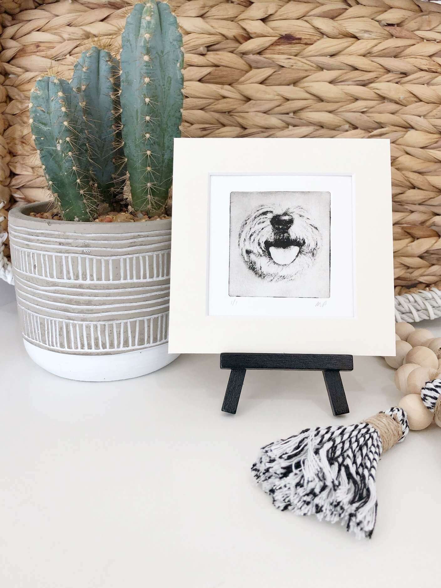 - One handcrafted pre-made pet nose portrait from Greyboy Pet Prints in 5x5 inch mat