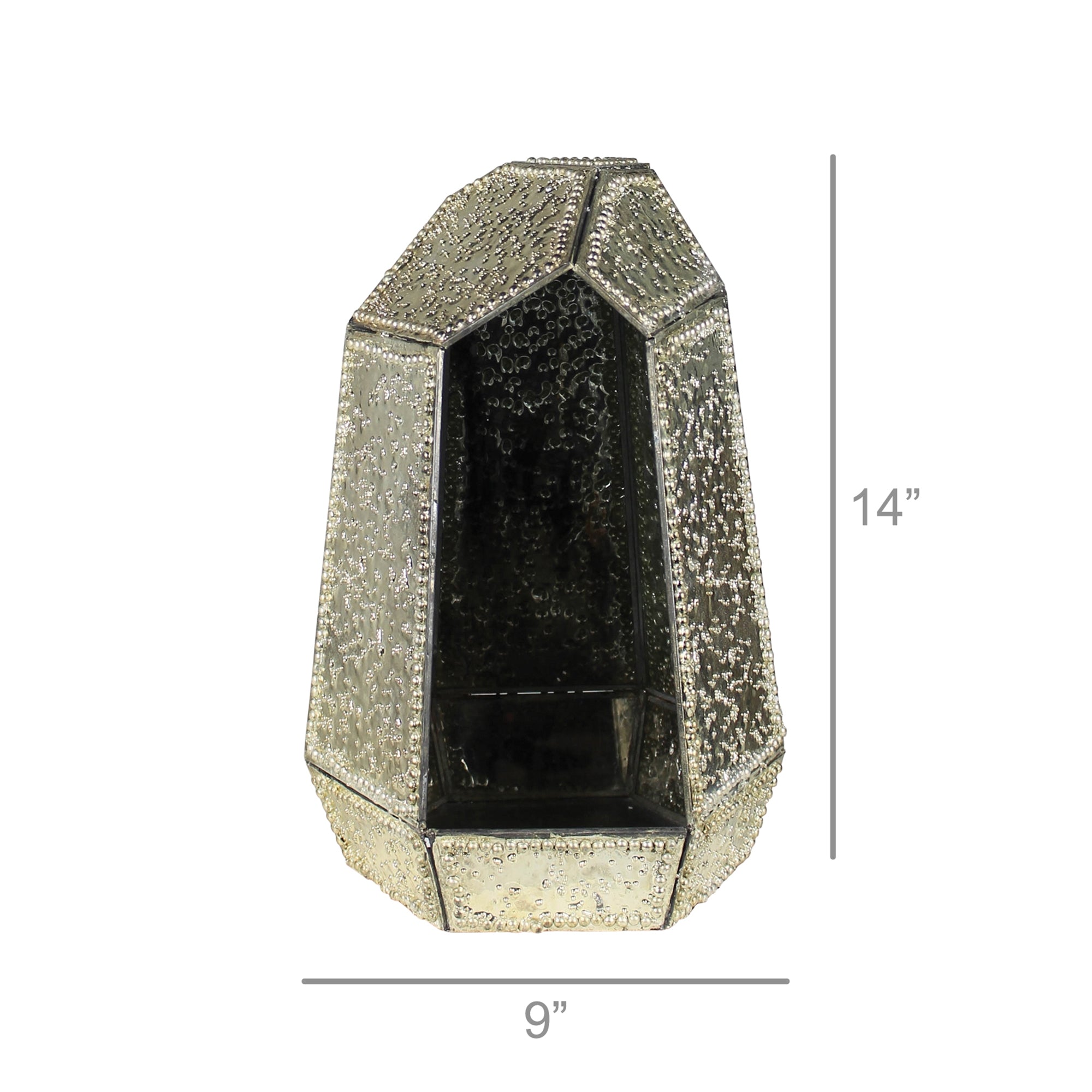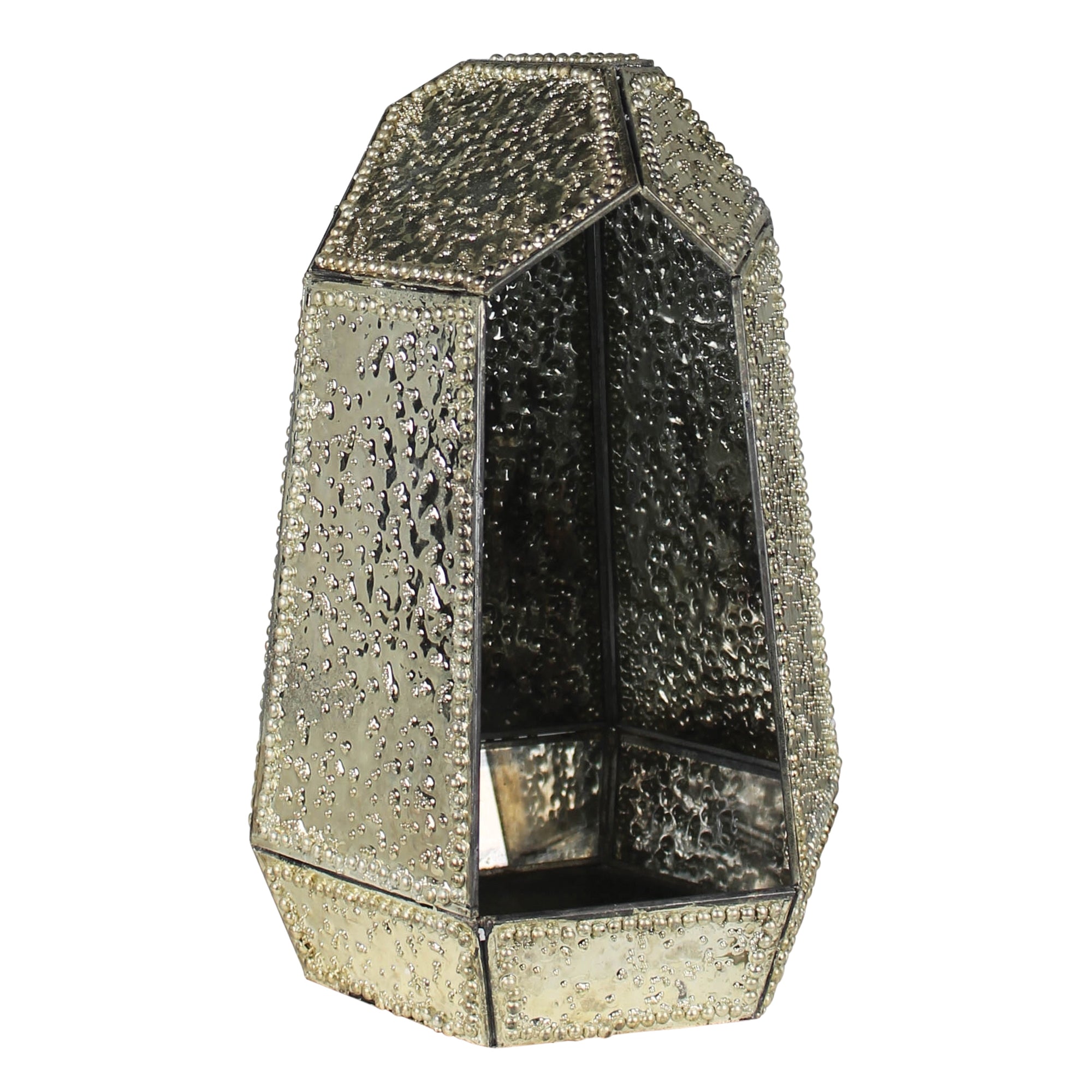 Multiple pieces of leaded glass with a deeply textured enameled silver finish come together to create a fascinating object that when lit inside with a candle, reflects and refracts the light.