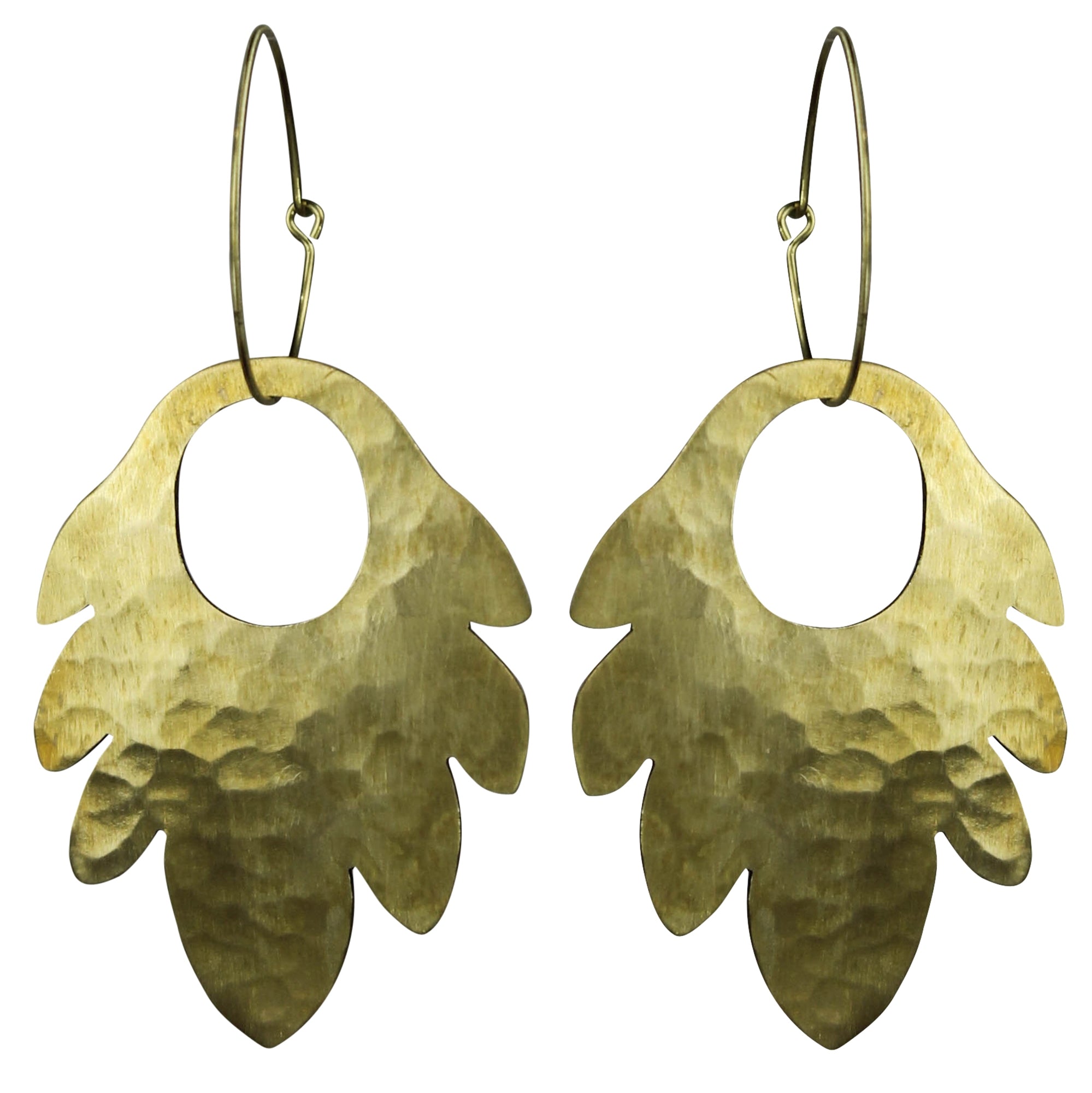 A pair of hammered brass earrings shaped like Philodendron flowers. The textured finish and warm metallic tone create an elegant, nature-inspired look, capturing the graceful beauty of the flower in a striking, timeless accessory.