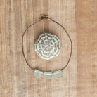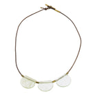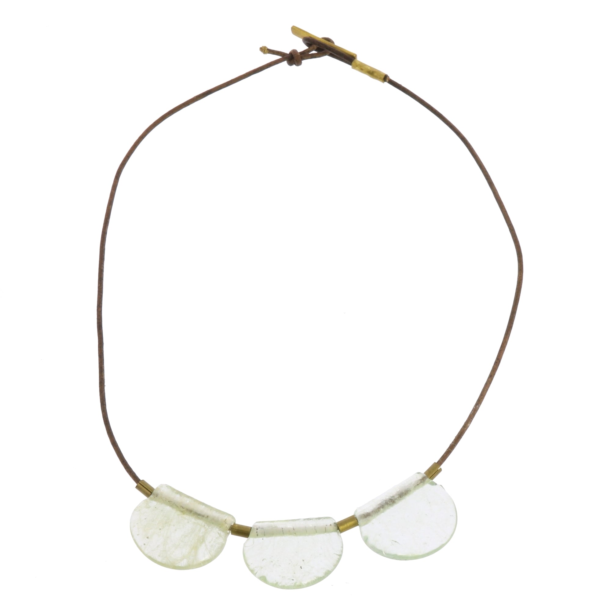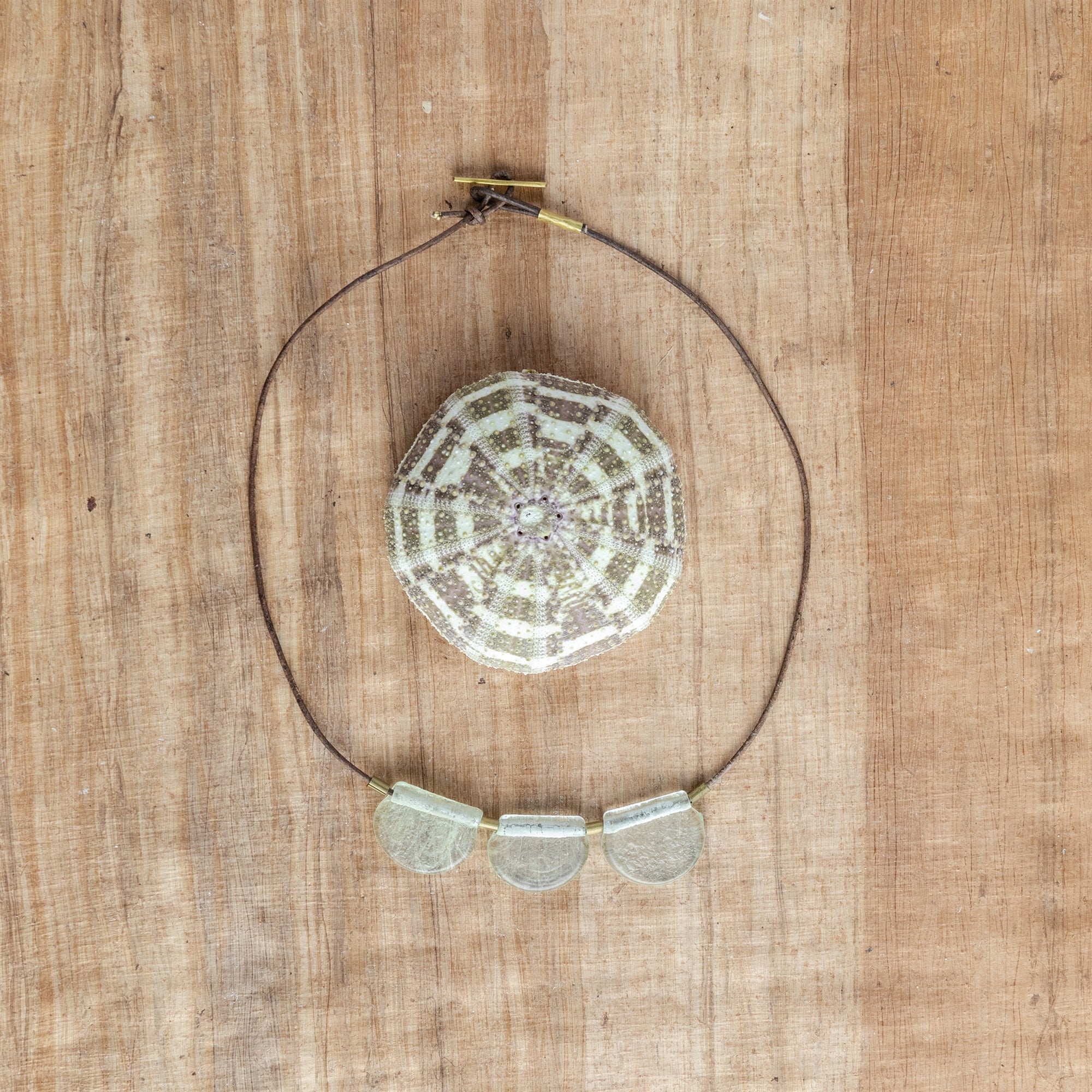 Recycled glass is pressed into half circle beads and paired with brass for a distinctly oceanic feel. The necklace is strung on an adjustable soft leather cord. 18" diameter