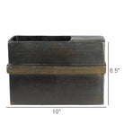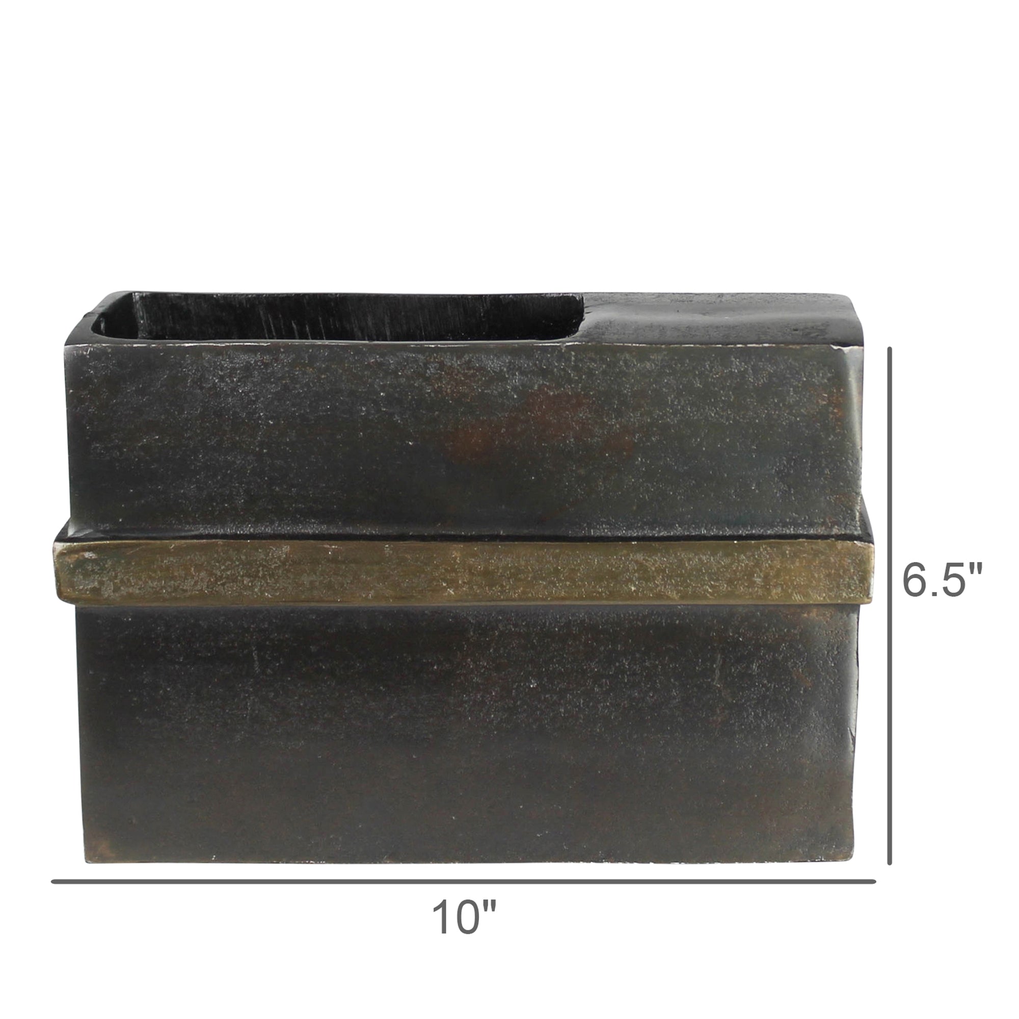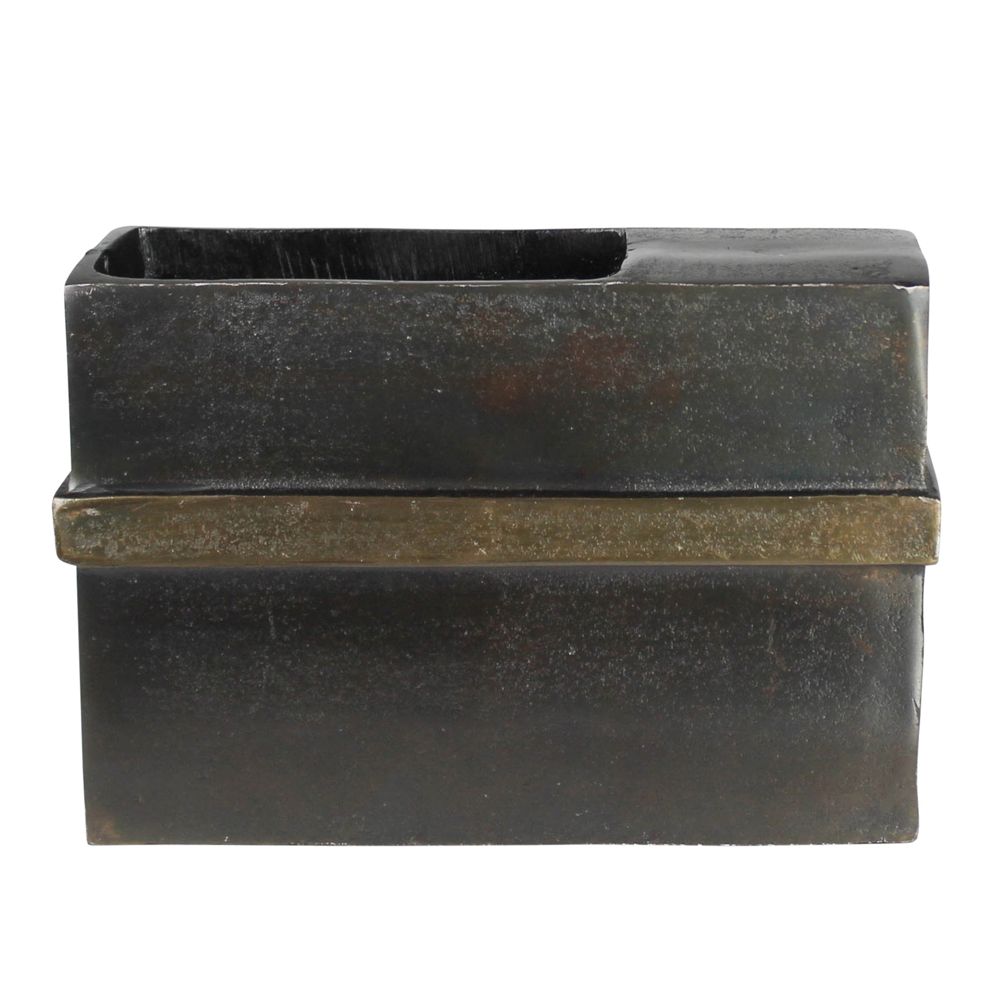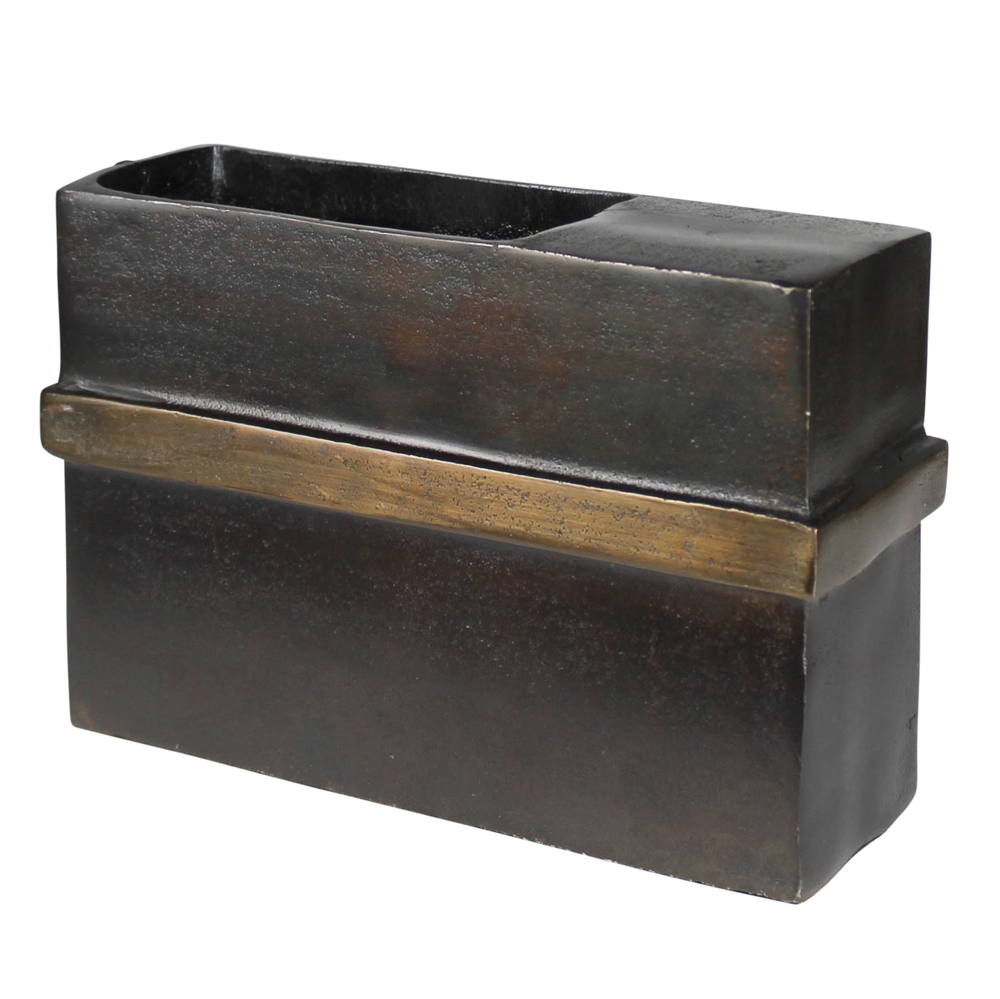 Cast of aluminum in a bold shape with an offset opening this vase feature a striking combination of a bronze body and brass bands.