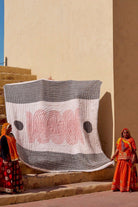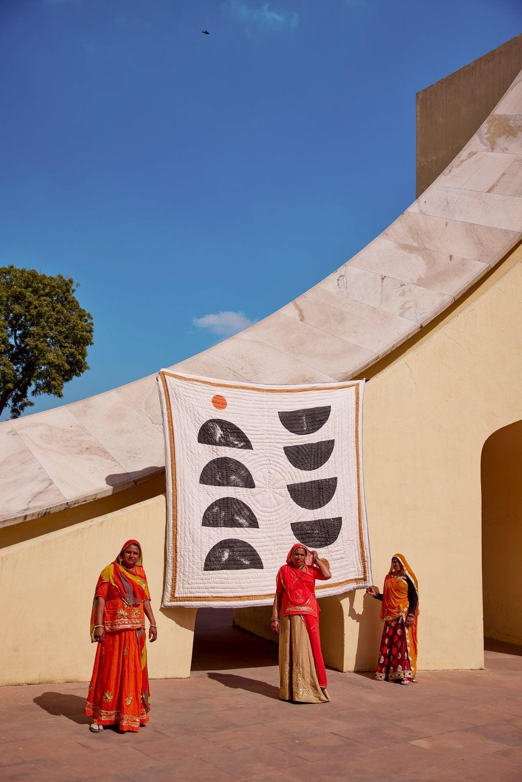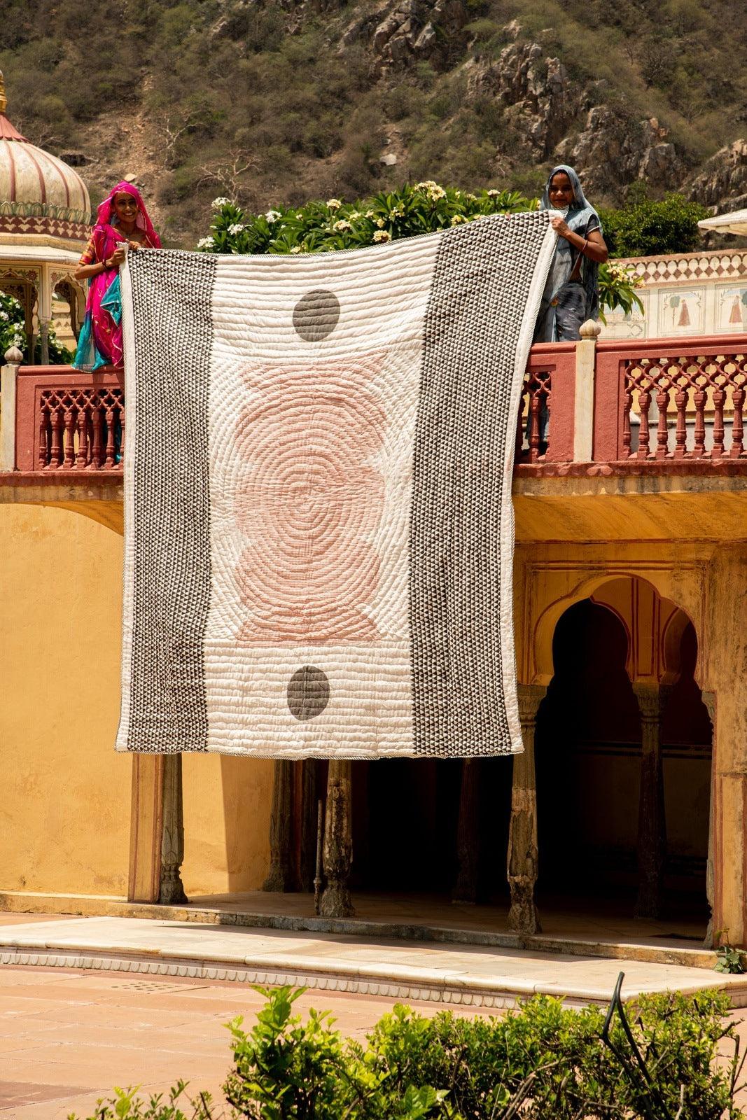 The design is hand-pressed onto each quilt using hand-carved wooden blocks dipped in dyes. The printed cotton shells are brought to the homes of quiltmakers, who stuff and stitch the quilts by hand, creating the final product.