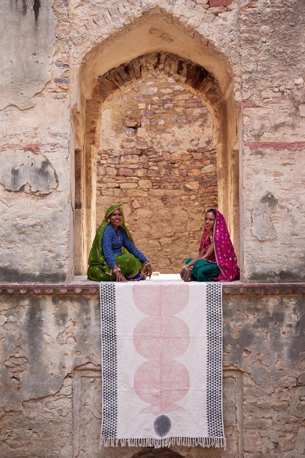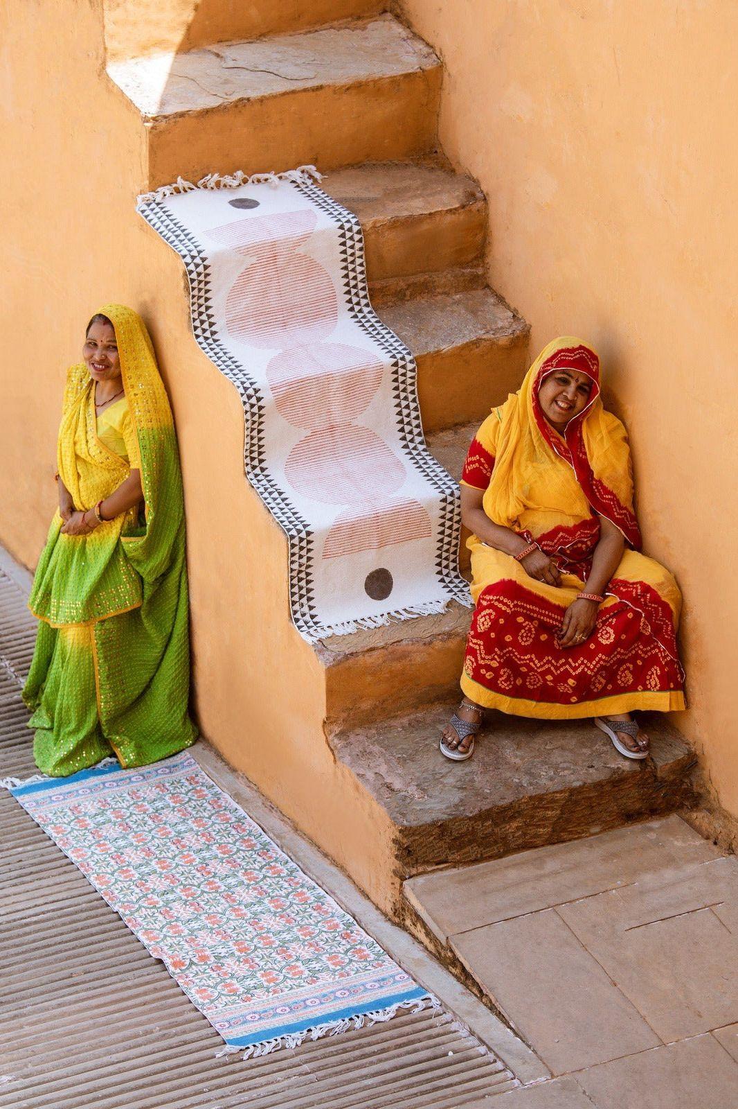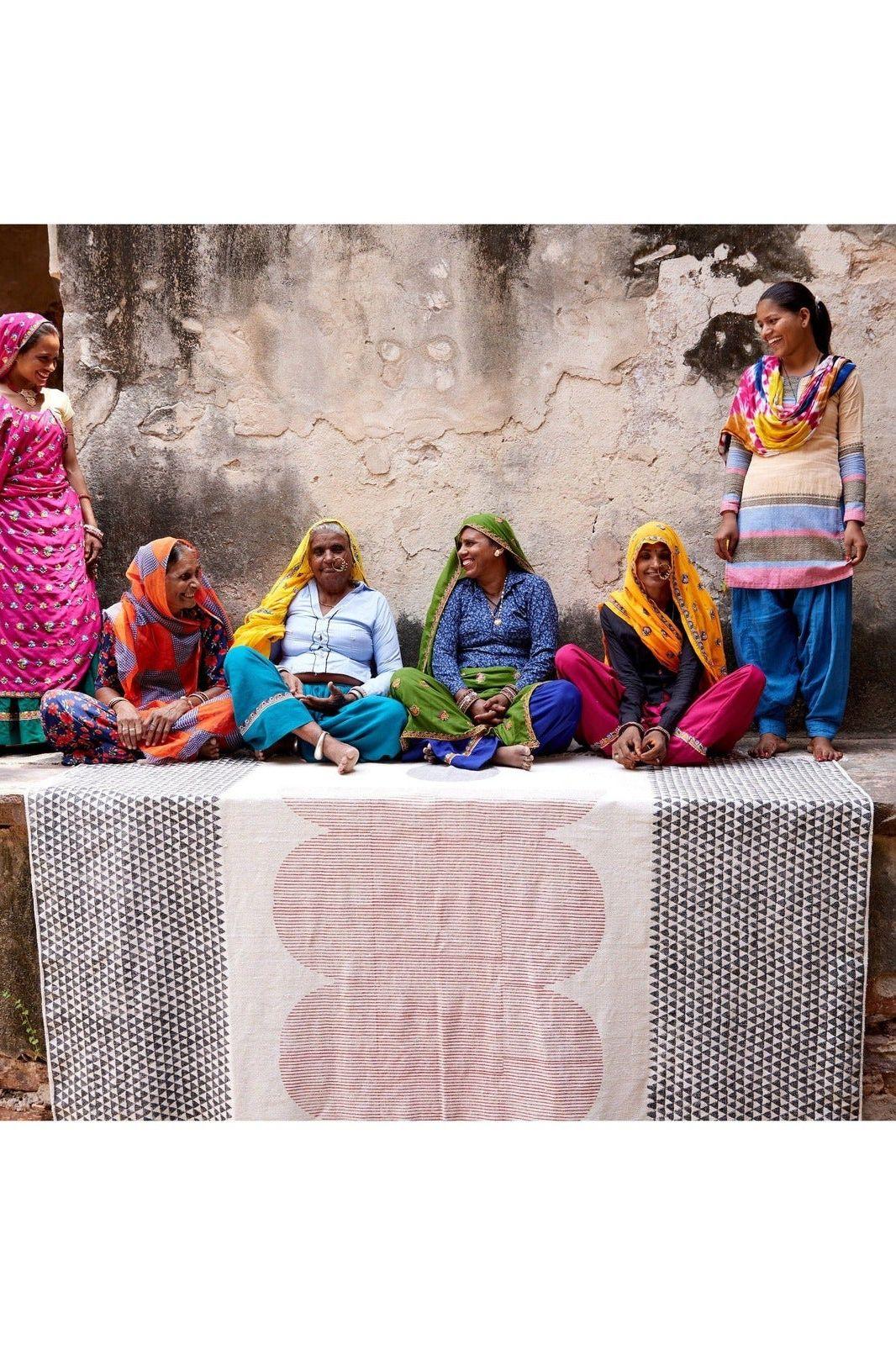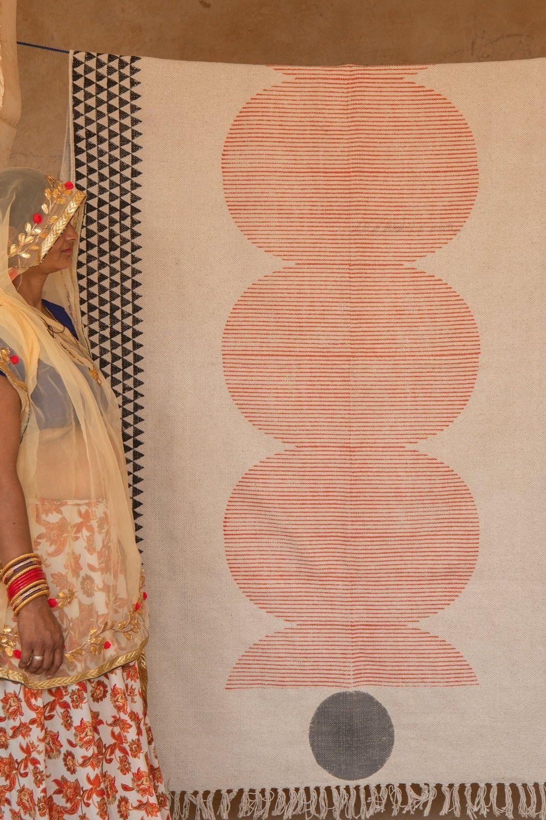 Each rug is handmade, requiring attention from 4 artisans, including wood carvers, block printers, weavers, and dye specialists.