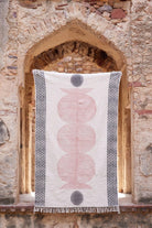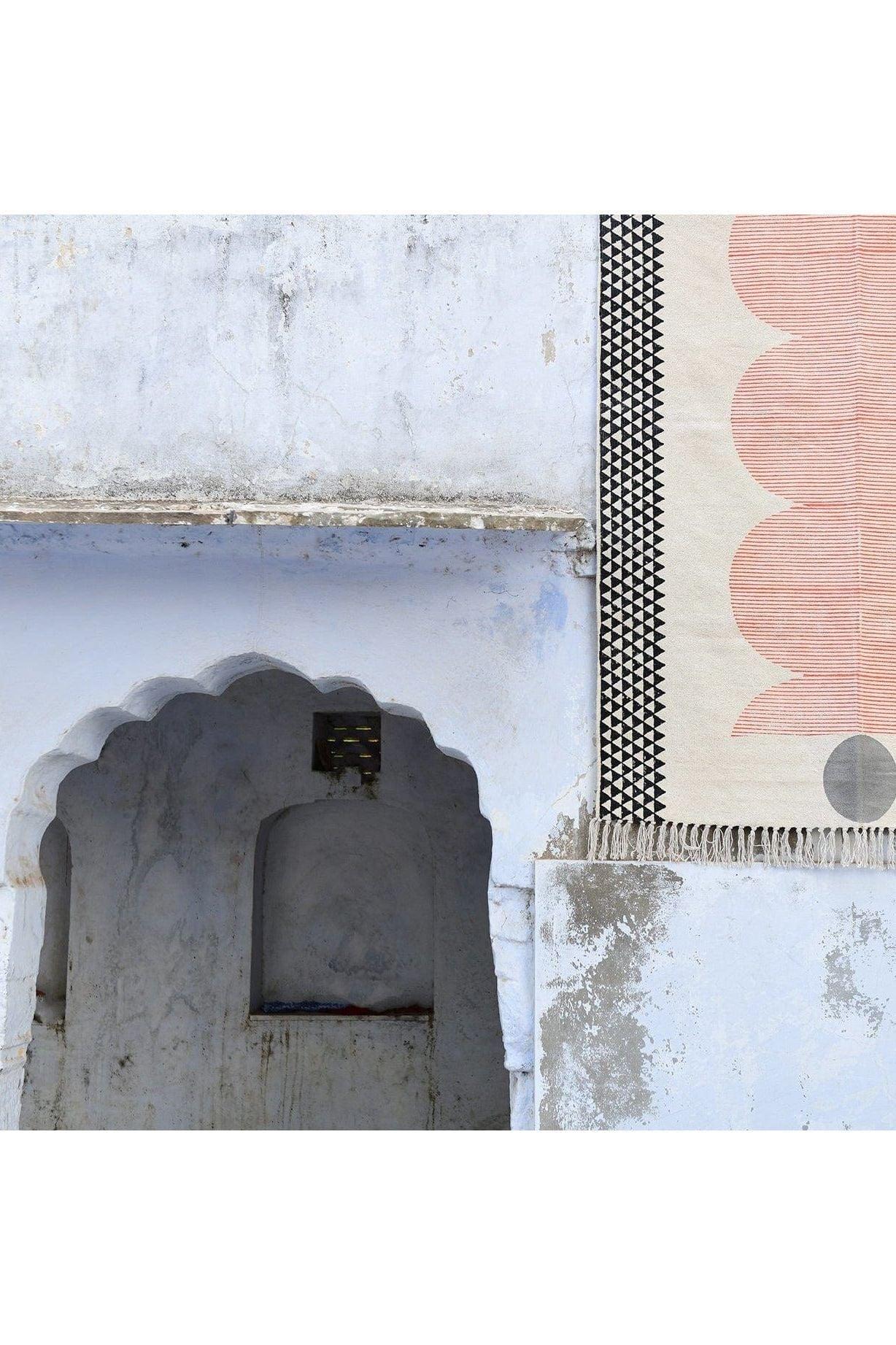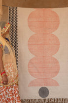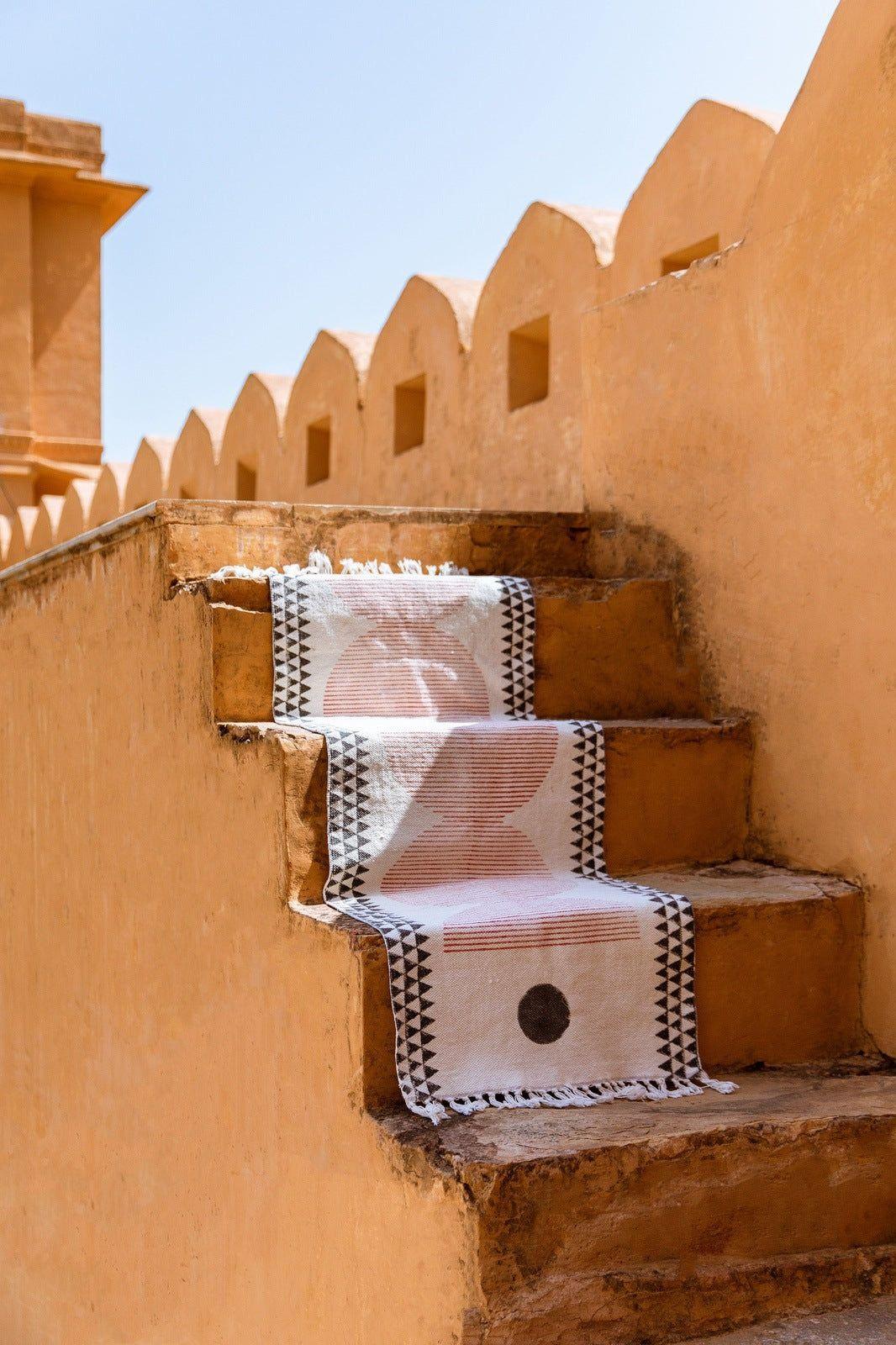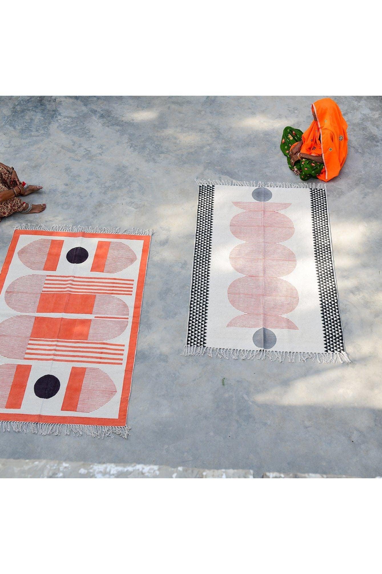 The design is hand-pressed onto each rug using hand-carved wooden blocks dipped in dyes. All rugs are made in small batches.