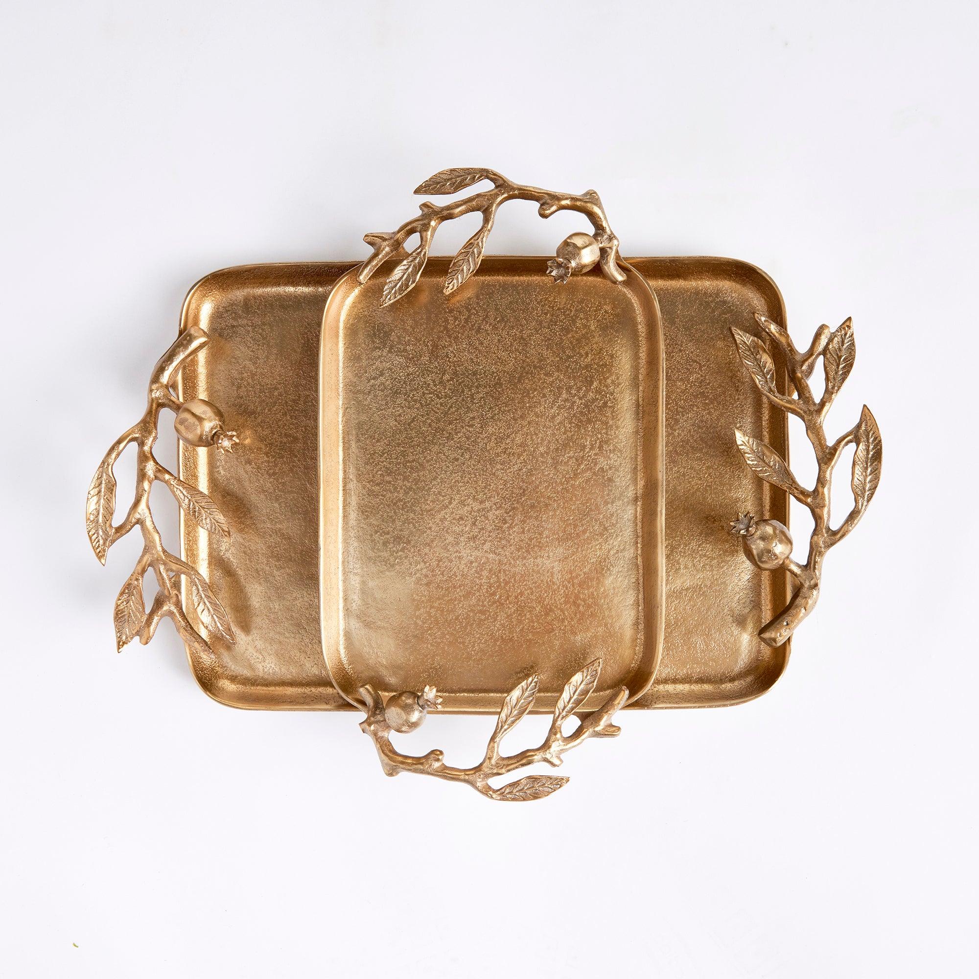Made of a solid cast aluminum, these trays are adorned with traditional pomegranate designs on the handles. Finished in a warm gold they are an elegant addition for the traditional space.