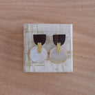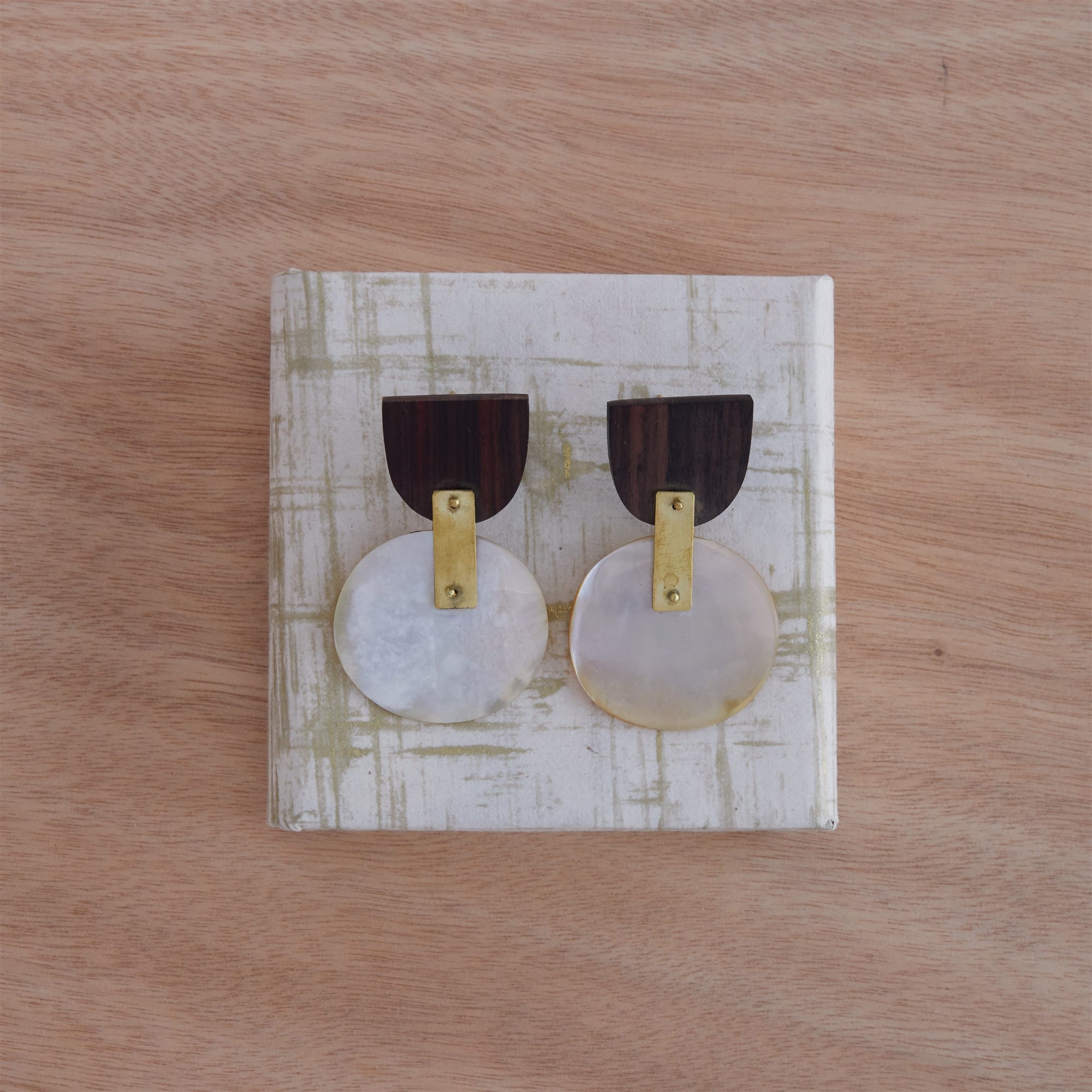 Wood and Mother of Pearl are bound together with a brass rod, the idyllic trio of materials. Post-style earrings.