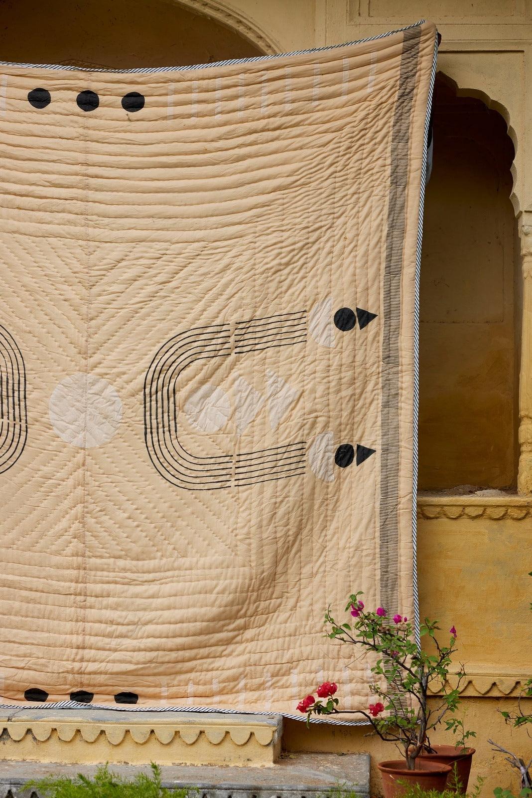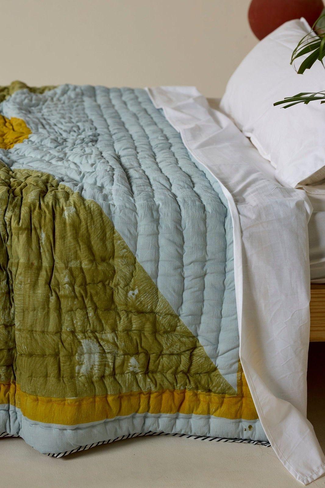 The design is hand-pressed onto each quilt using hand-carved wooden blocks dipped in dyes. The printed cotton shells are brought to the homes of quiltmakers, who stuff and stitch the quilts by hand, creating the final product.