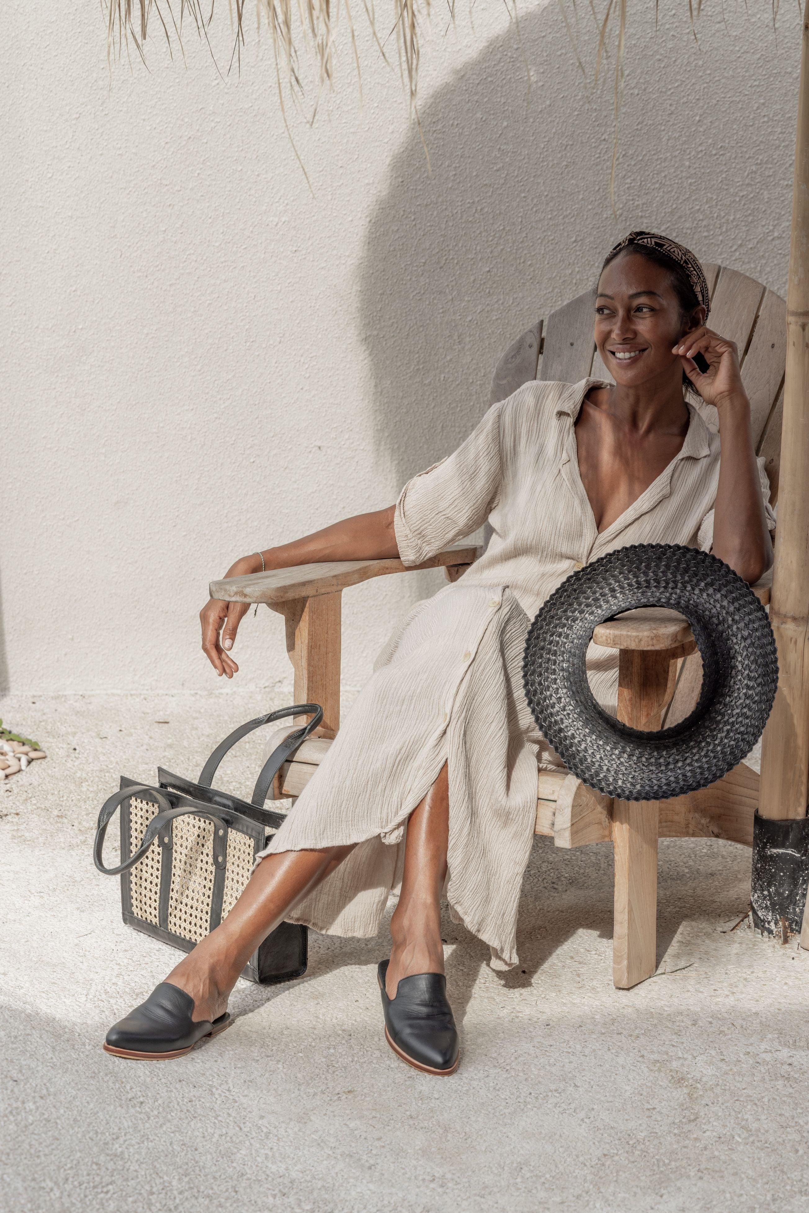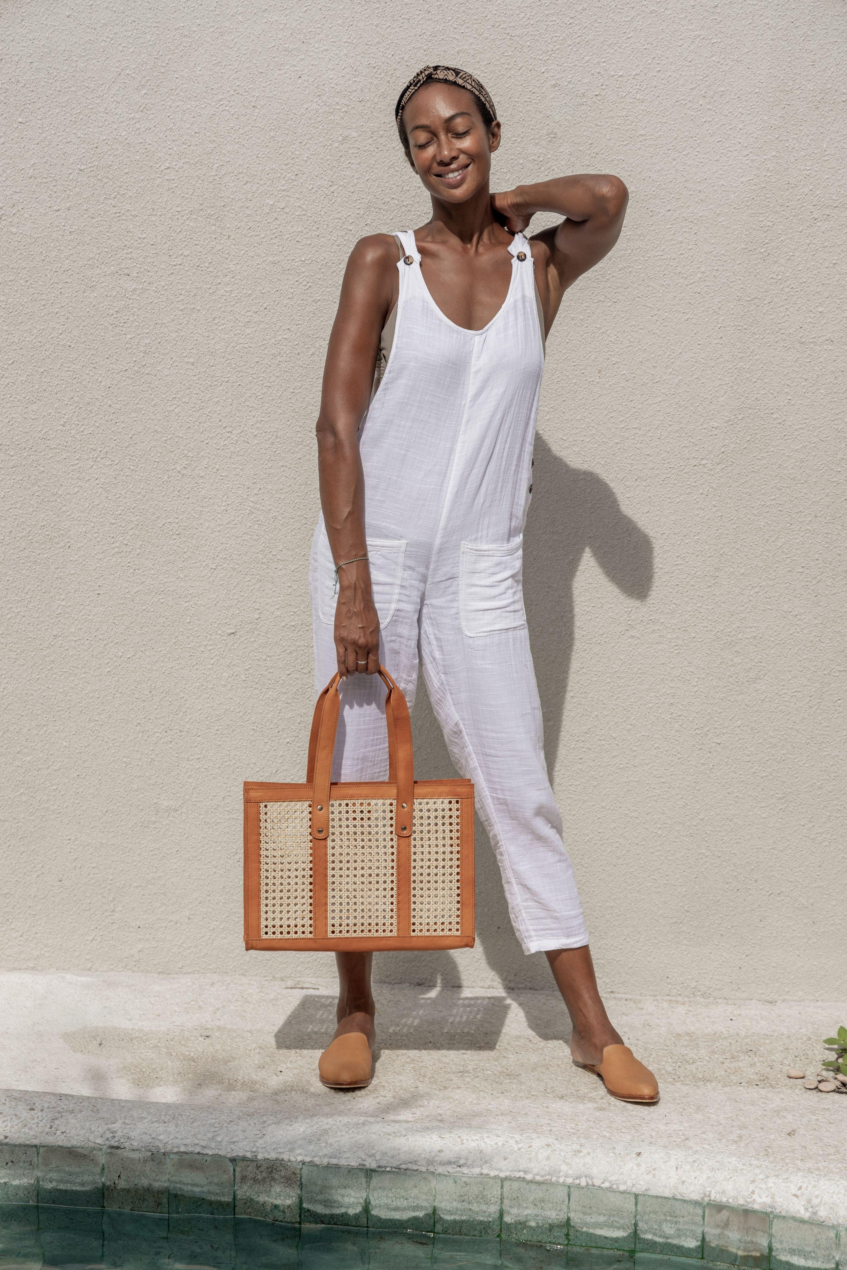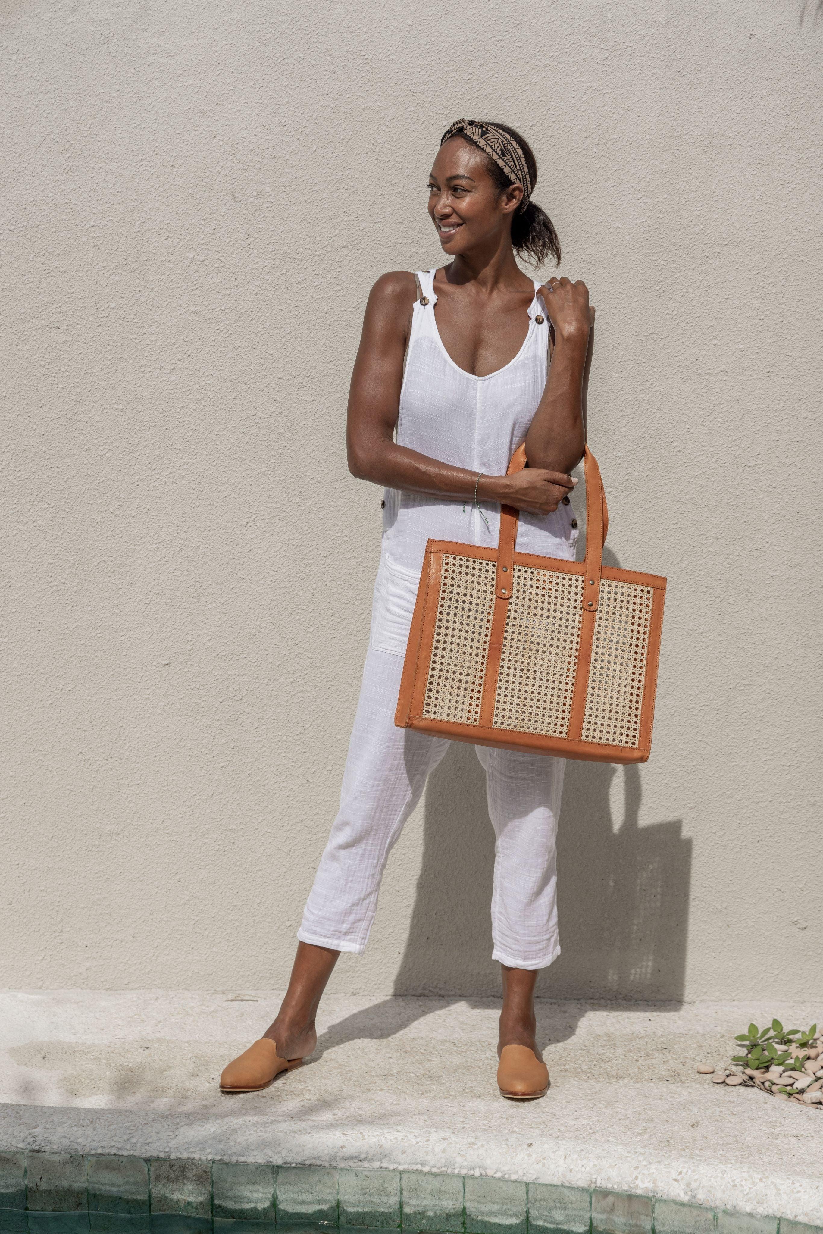 This elevated bag features leather detailing and gorgeous cane webbing. These natural elements combine beautifully to create a sophisticated yet casual feel. Each bag is handmade by our Balinese Artisan Partners and tells a story of craft, culture and innovation. Available in three sizes and two colorways - Camel and Black.