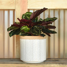 This stoneware cachepot with a hand sculpted pattern is glazed in white and sized to drop in a standard 6" growers pot. Indoor gardening made easy!