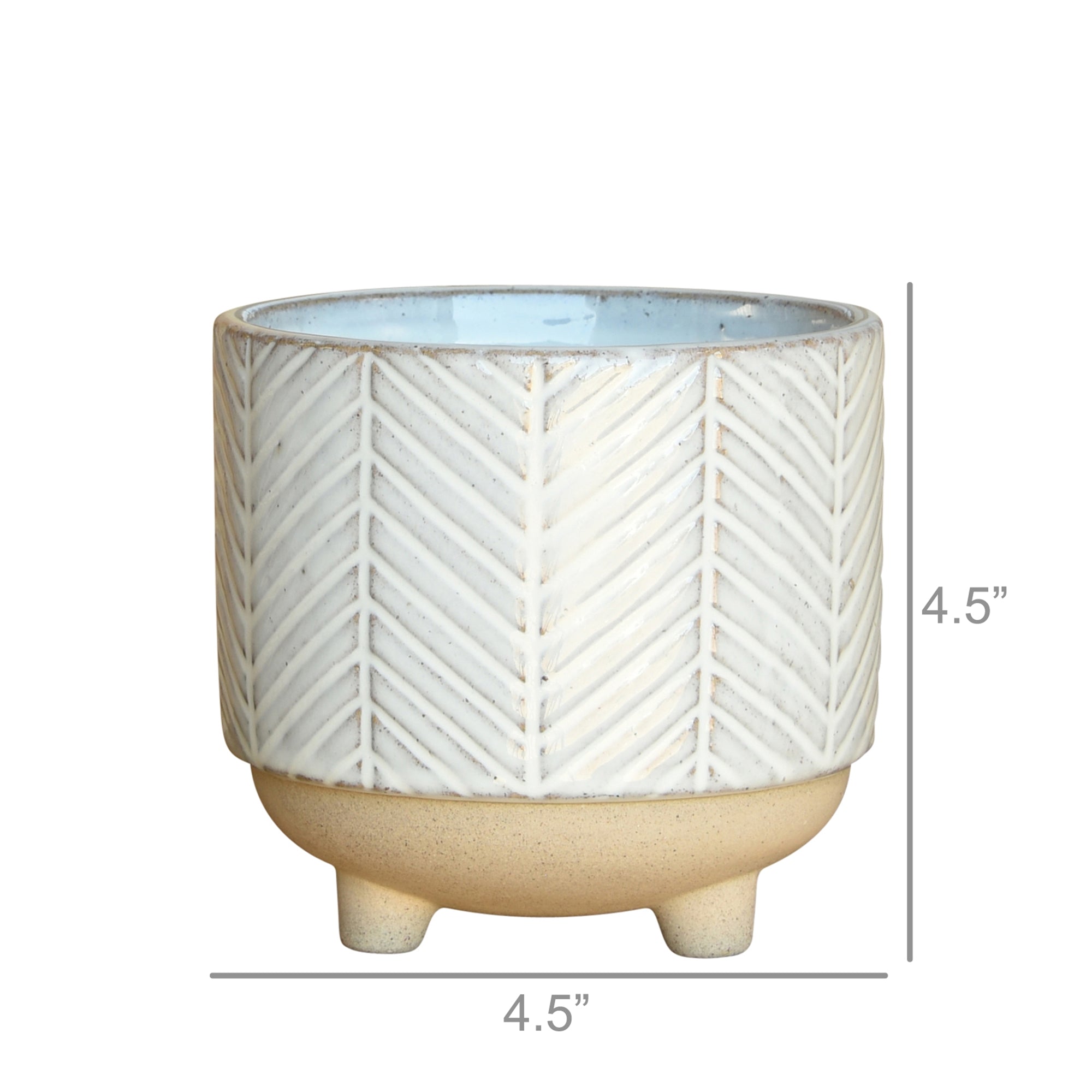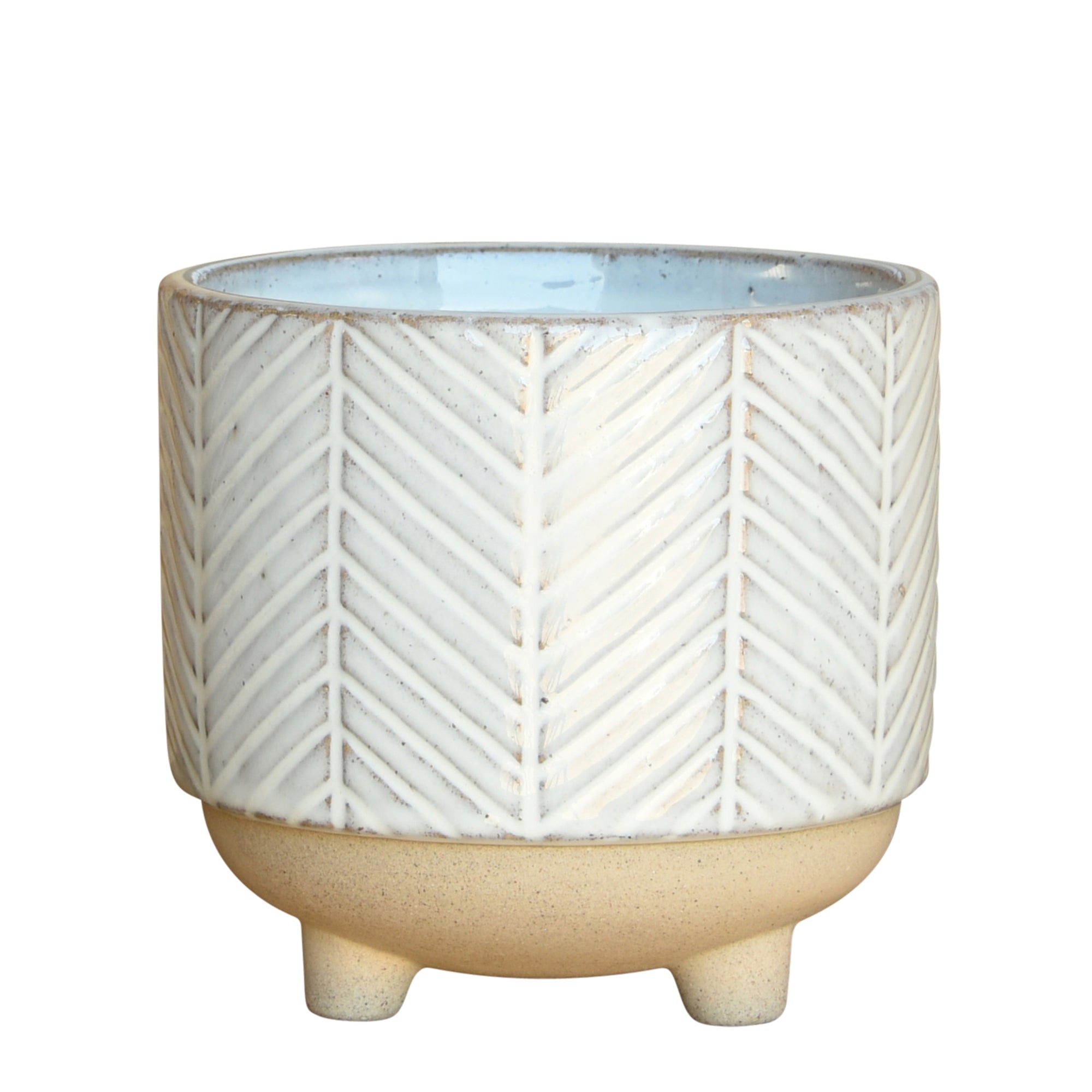 This stoneware cachepot with a hand sculpted pattern is glazed in white and sized to drop in a standard 4" growers pot. Indoor gardening made easy!