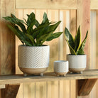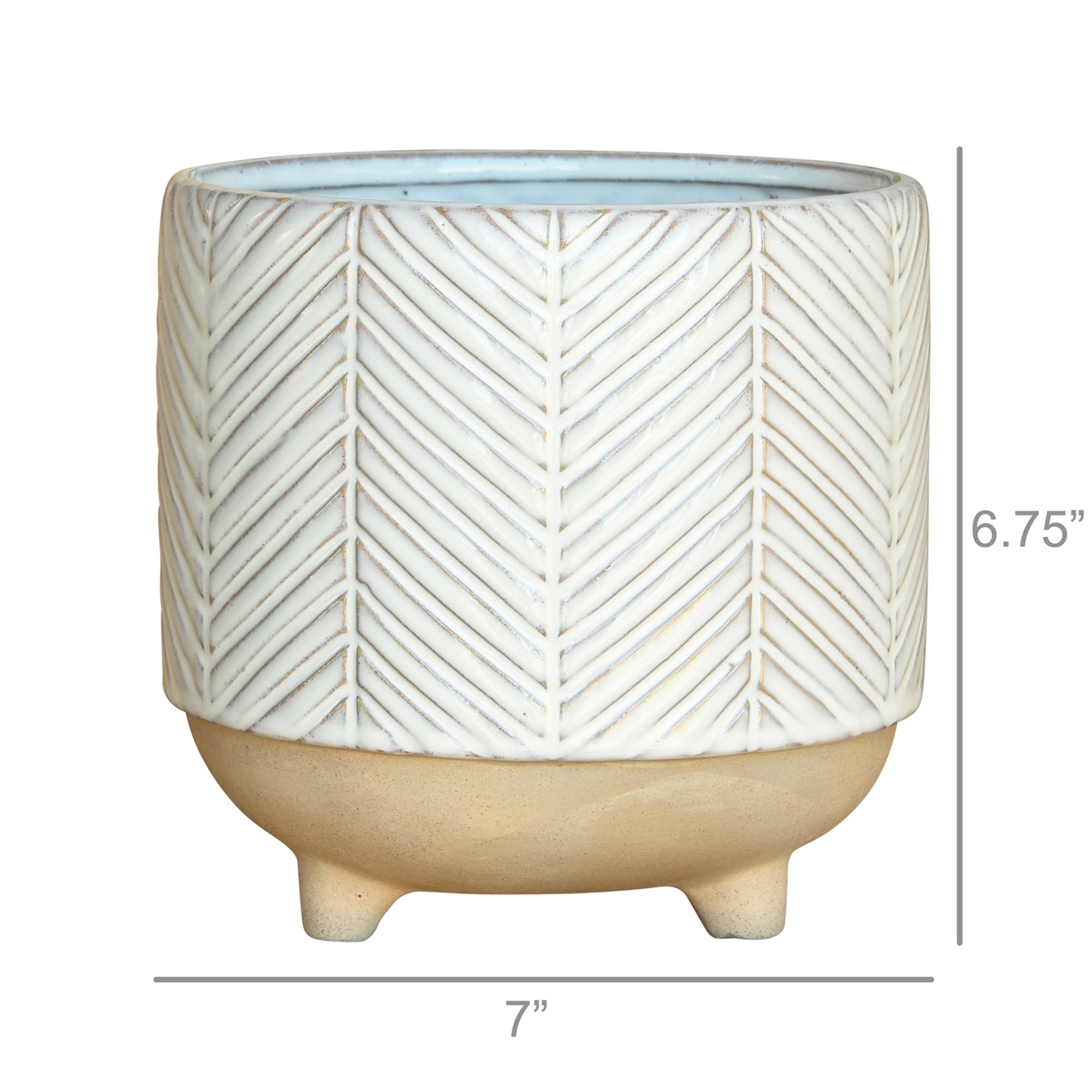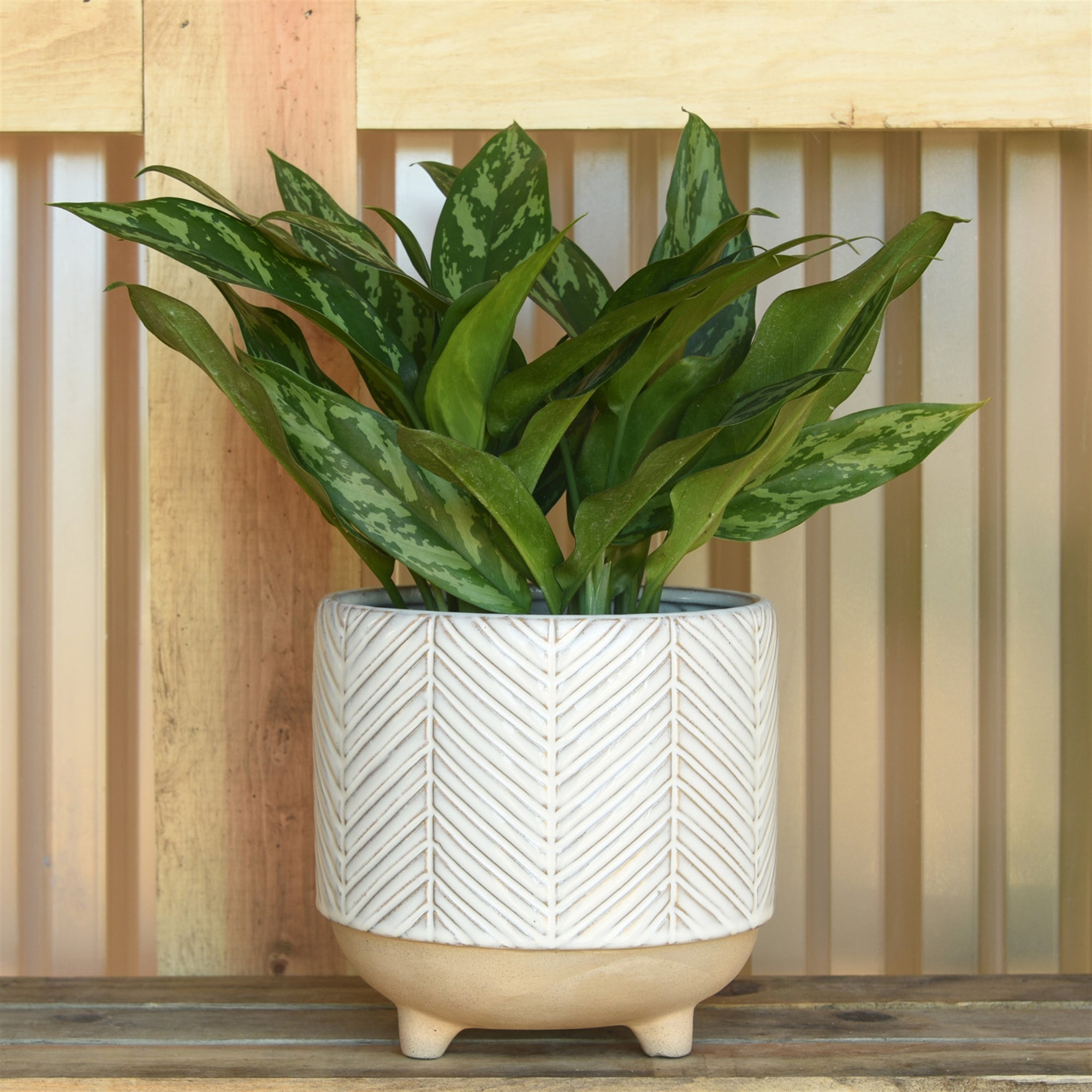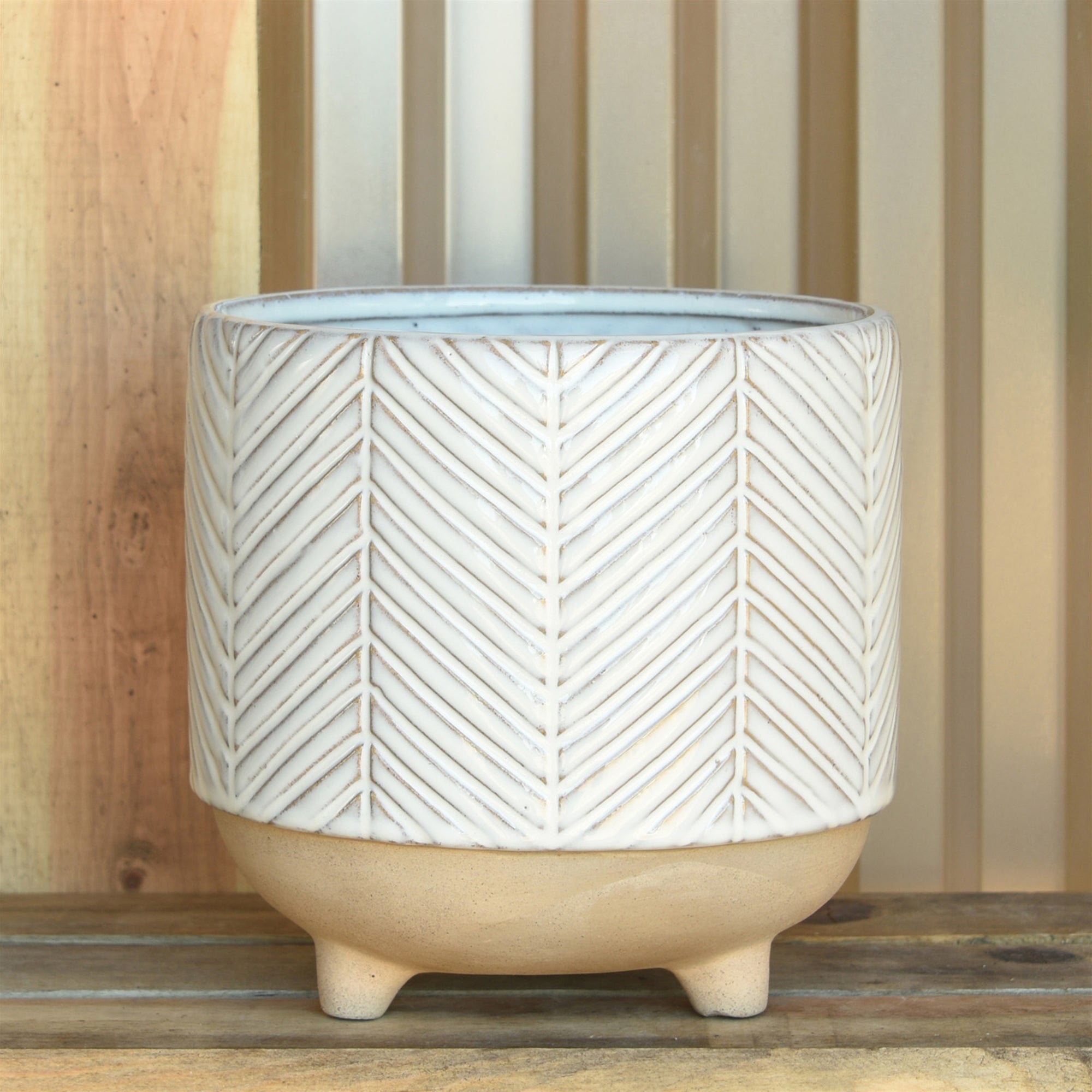 This stoneware cachepot with a hand sculpted pattern is glazed in white and sized to drop in a standard 6" growers pot. Indoor gardening made easy!