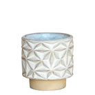 This stoneware cachepot with a hand sculpted pattern is glazed in white and sized to drop in a standard 2.5" growers pot. Indoor gardening made easy!